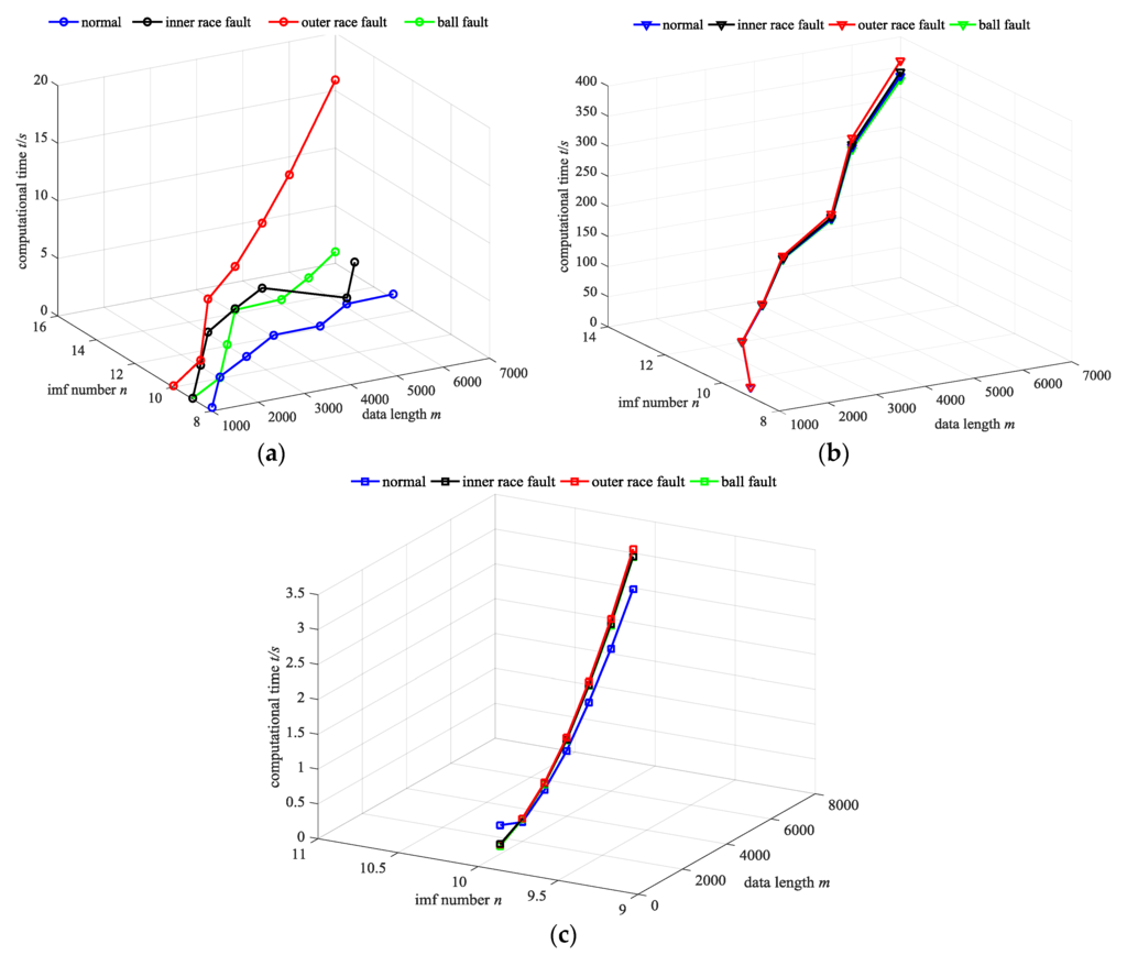 The relationship curve of the data length, IMF number and computational time. (a) EMD algorithm; (b) EEMD algorithm; (c) fast EEMD algorithm.