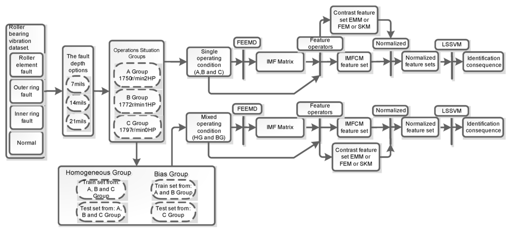 This paper contains seven sections. The first part introduces the basis of the study. The second section presents the research framework. The third part considers the instruction of the algorithms used to extract the fault features, and contains two subsections: the fast empirical mode decomposition algorithm and the definition and computation scheme of IMF correntropy matrix. The fourth sections discusses the application of IMFCM in fault identification, and contains two sub-sections: a brief overview of the Least Squares Support Vector Machine method and an evaluation of the identification consequence. The fifth section contains a case study and applicability experiment that considers both a Stationary Operating Situation and Cross-mixed Operating Situation. The sixth section is a discussion that analyzes the results of the experiment. The last part is the conclusion which summarizes the whole research work.