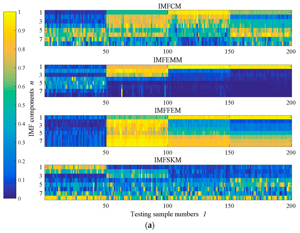 Through experiments considering single and cross-mixed operating situations, IMFEMM, IMFFEM, and IMFSKM were compared in their ability to diagnose roller bearing faults. The compared diagnosis results verify that IMFCM has the highest fault divisibility and robustness of its operating state in both single and mixed operating conditions. To be expanded for further consideration, the identification of roller bearing damage degree has great significance in improving the ability of fault warnings. In the future, the application of IMFCM could focus on performance degradation detection and identification of the degree of damage to rotary machines.