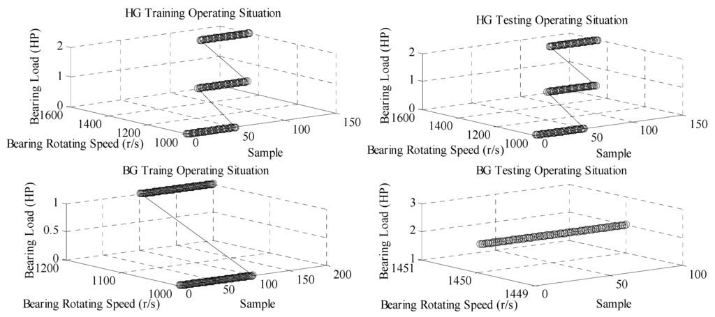 Step one: data extraction. Two hundred continuous samples are selected randomly from each roller bearing fault style dataset in group A, B, and C, respectively. The first 150 continuous samples of each fault style are intercepted, respectively, in group A, B, and C which are then mixed as a training set while another 150 samples from each group are designated as the testing set. As such, the total training set sample number is 450 with an equally sized testing set sample number. This fashion of cross-mixed rotating conditions follows the principle of distributing the training and testing dataset on the average of each group, which is called a Homogeneous Group (HG). Another method chooses 100 continuous samples of each fault style in group A and B both randomly as the training dataset, and 100 continuous samples of each fault style in group C as the testing dataset. This mixing fashion extracts the training dataset and testing dataset from different operating situations, respectively, so that it is called Biased Group (BG). The roller bearing operating parameter distributions in HG and BG are shown in Figure 8.