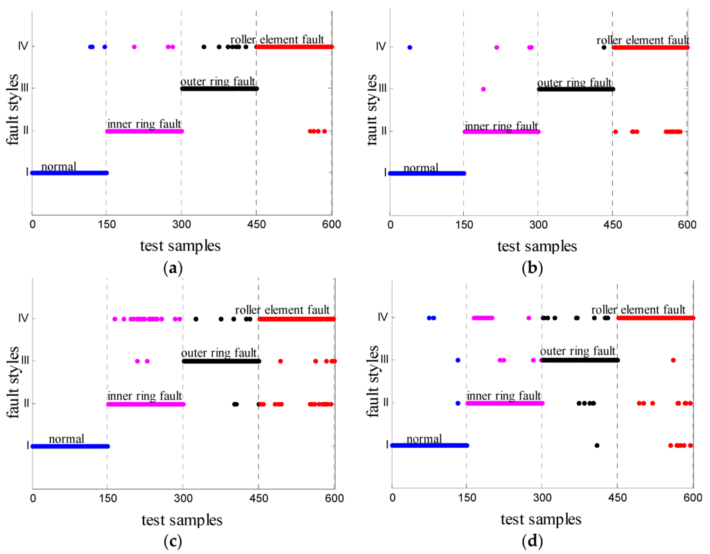Fault identification result of Homogeneous Group (0.014 inches). (a) IMFCM; (b) IMFEMM; (c) IMFFEM; (d) IMFSKM.