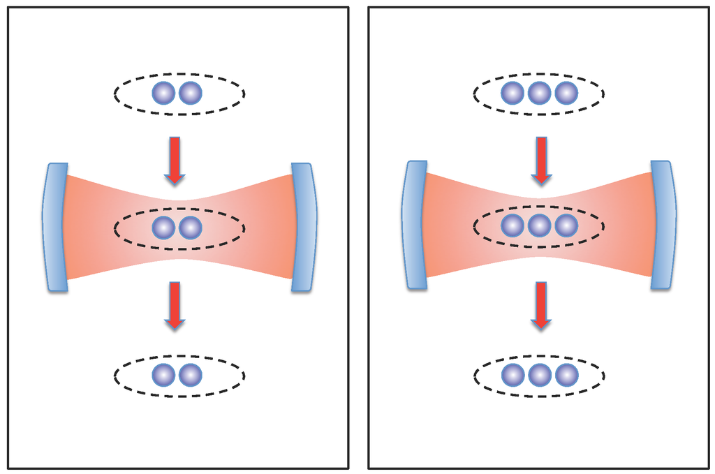 Figure 1. A schematic of the two- and three-atom micromaser model, where clusters of two-level atoms are injected into a single-mode cavity repeatedly in a Poissonian random sequence. The transition time of the atoms through the cavity is much shorter than the cavity lifetime, atomic relaxation and dephasing times or the mean free-time between the interactions, so that there can be at most one cluster present in the cavity at a time. The cavity-mode steady-state crucially depends on the state of the cluster, as shown here.