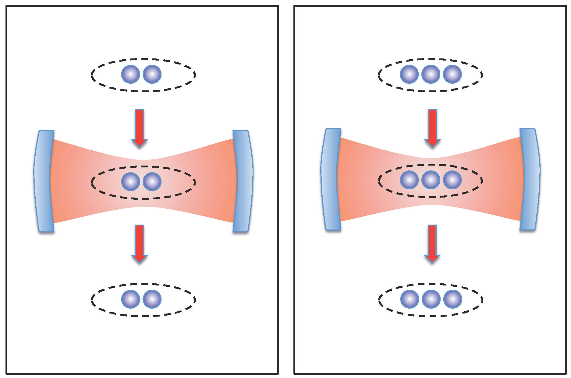 A schematic of the two- and three-atom micromaser model, where clusters of two-level atoms are injected into a single-mode cavity repeatedly in a Poissonian random sequence. The transition time of the atoms through the cavity is much shorter than the cavity lifetime, atomic relaxation and dephasing times or the mean free-time between the interactions, so that there can be at most one cluster present in the cavity at a time. The cavity-mode steady-state crucially depends on the state of the cluster, as shown here.