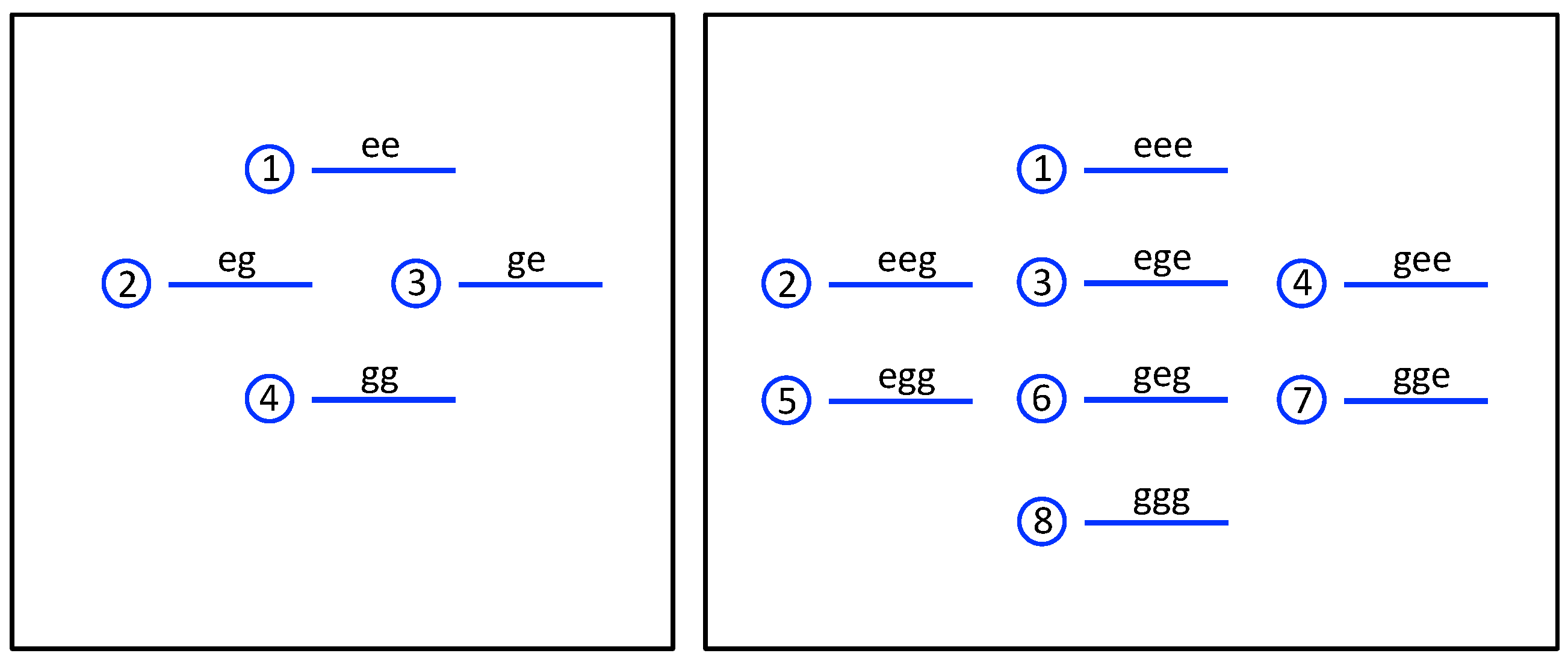 where denote the matrix elements of . In the standard basis of energy-state products, the diagonal elements are the populations and the off-diagonal elements with the coherences or quantum correlations, respectively. This standard basis is for one atom and shown in Figure 2 for two () and three atoms, respectively.