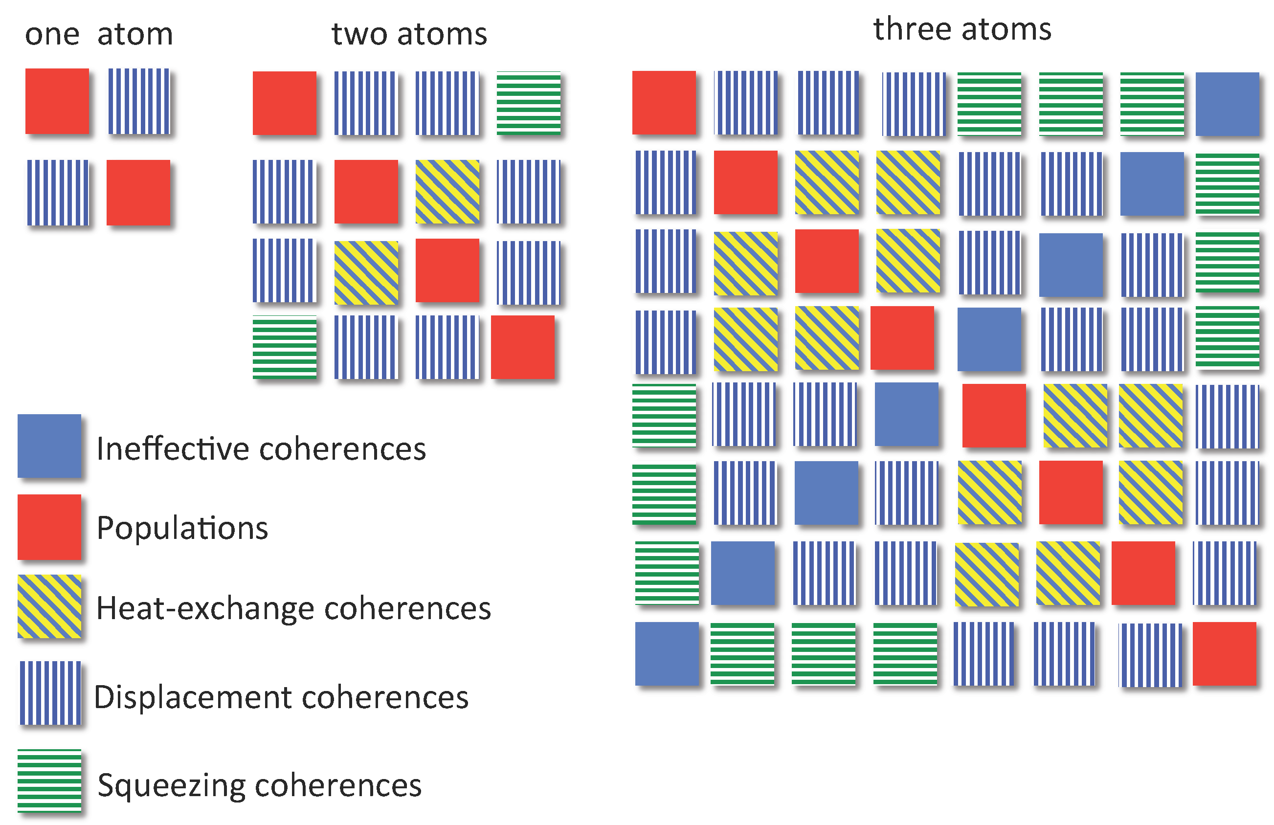 Density matrix of the atomic cluster for one (left), two (middle) and three (right) atoms, respectively, with color- and pattern-filled squares representing the different roles of the coherences with respect to the cavity-field evolution described by the master Equation (7). Red plain dark squares are populations, and light blue squares are ineffective coherences. Yellow diagonal striped squares are zeroth order coherences that can contribute to thermalization. Dark blue vertical striped squares are first order coherences that can contribute to the coherent displacement of the cavity field. Green horizontal striped squares are second order coherences contributing to the squeezing of the cavity field.