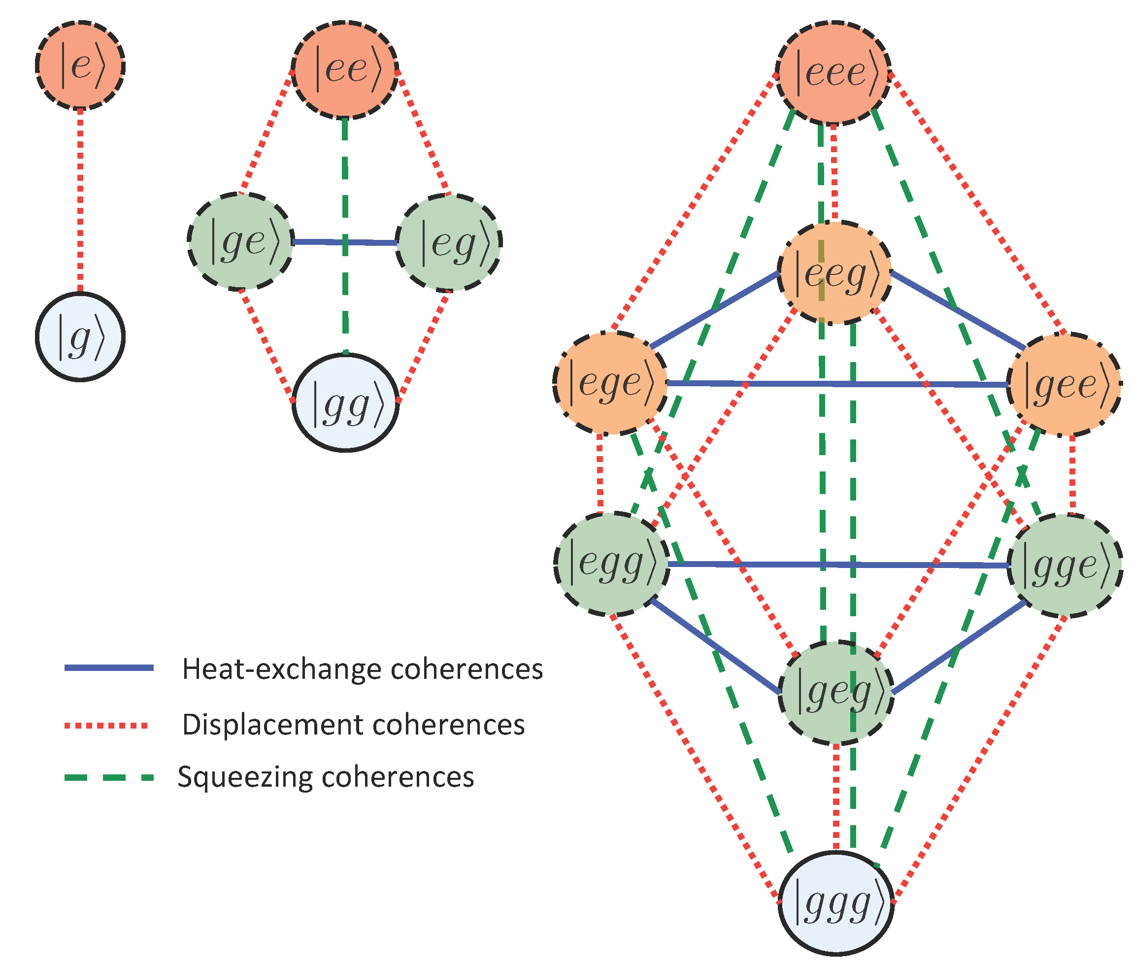 The key observation we infer from Equation (7) is that coherences or correlations in the multiatom cluster may be classified according to the disjoint blocks in the density matrix that are associated with qualitatively different terms in the master equation, each term giving rise to a different kind of field dynamics. Figuratively, the different coherences are different types of fuel for the cavity-field WF (Figure 3):