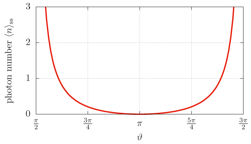 It is illuminating to derive the threshold condition from the mean photon number, following Reference [20]. We first take λ = ξ = 0 and thereby eliminate the coherent-displacement and squeezing terms. According to Equation (3), the cavity density matrix will change to