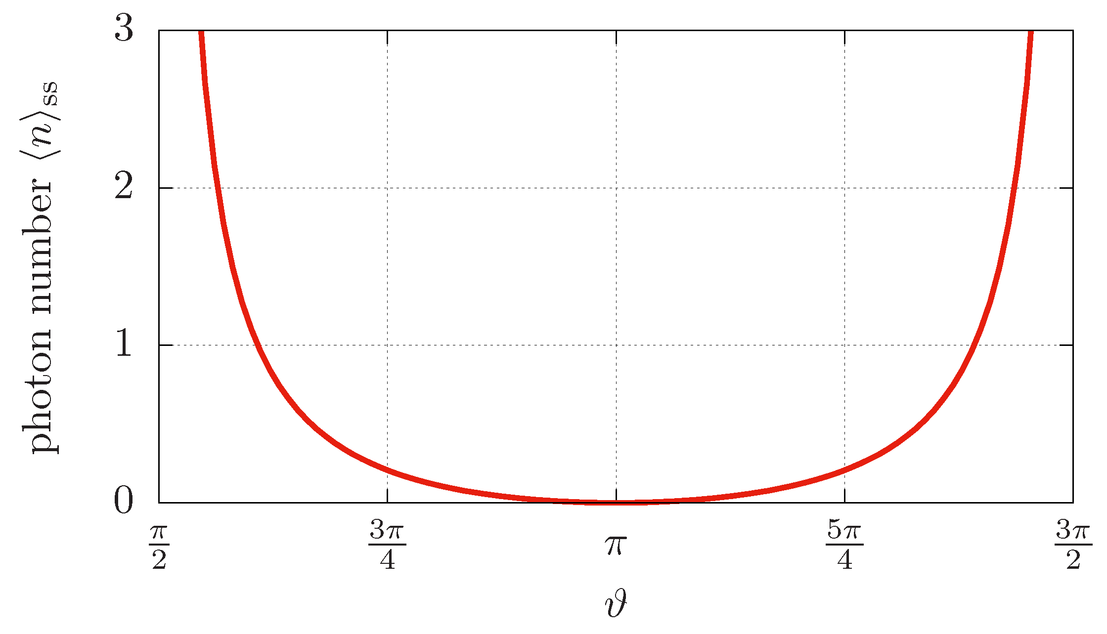 It is illuminating to derive the threshold condition from the mean photon number, following Reference [20]. We first take and thereby eliminate the coherent-displacement and squeezing terms. According to Equation (3), the cavity density matrix will change to