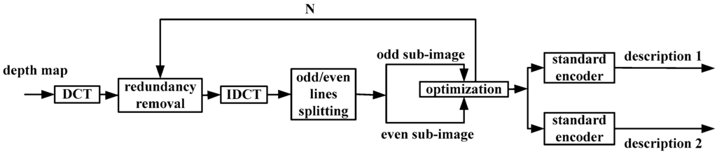 Figure 1. Here, the depth maps of any view can be encoded as follows. At the encoder, the depth map can be firstly transformed into the DCT domain. According to the characteristics of the high frequency coefficients of DCT, a Lagrange optimization approach is designed to determine the redundancy to be removed. After inverse DCT (IDCT, Inverse Discrete Cosine Transformation), the processed depth map can be separated by the means of odd or even lines. Here, the generated sub-images can be encoded by any standard codec to produce two descriptions.