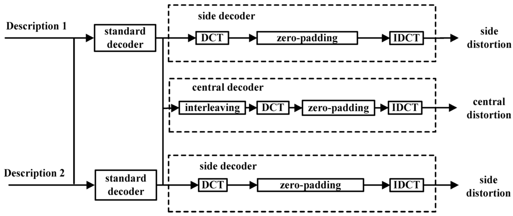 Then, we will discuss the design of the central decoder. For the central decoder, both descriptions can be received. Therefore, after standard decoding, Descriptions 1 and 2 are rearranged according to the odd and even lines. Then, with the same process in the side decoder, adaptive zero-padding can be used to fill zeros in the DCT domain. At last, we can obtain the reconstruction with central distortion.