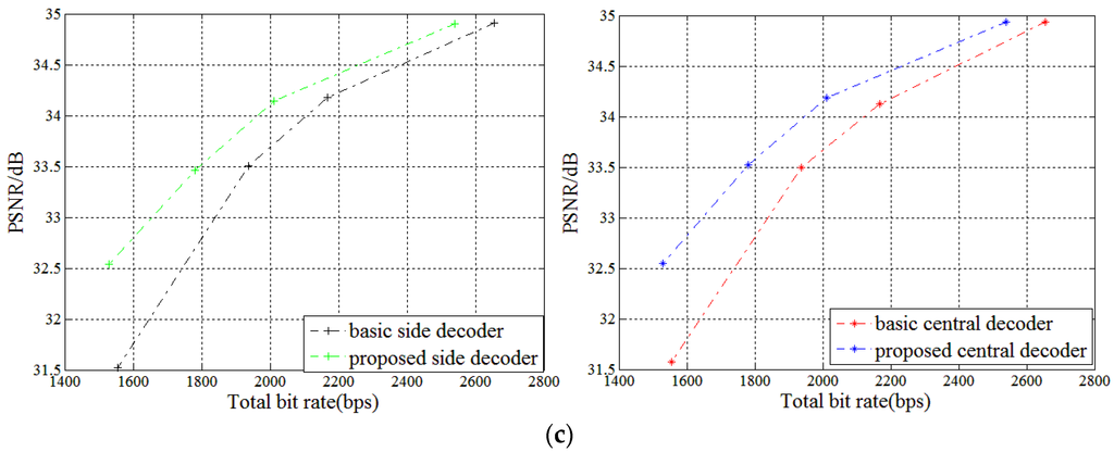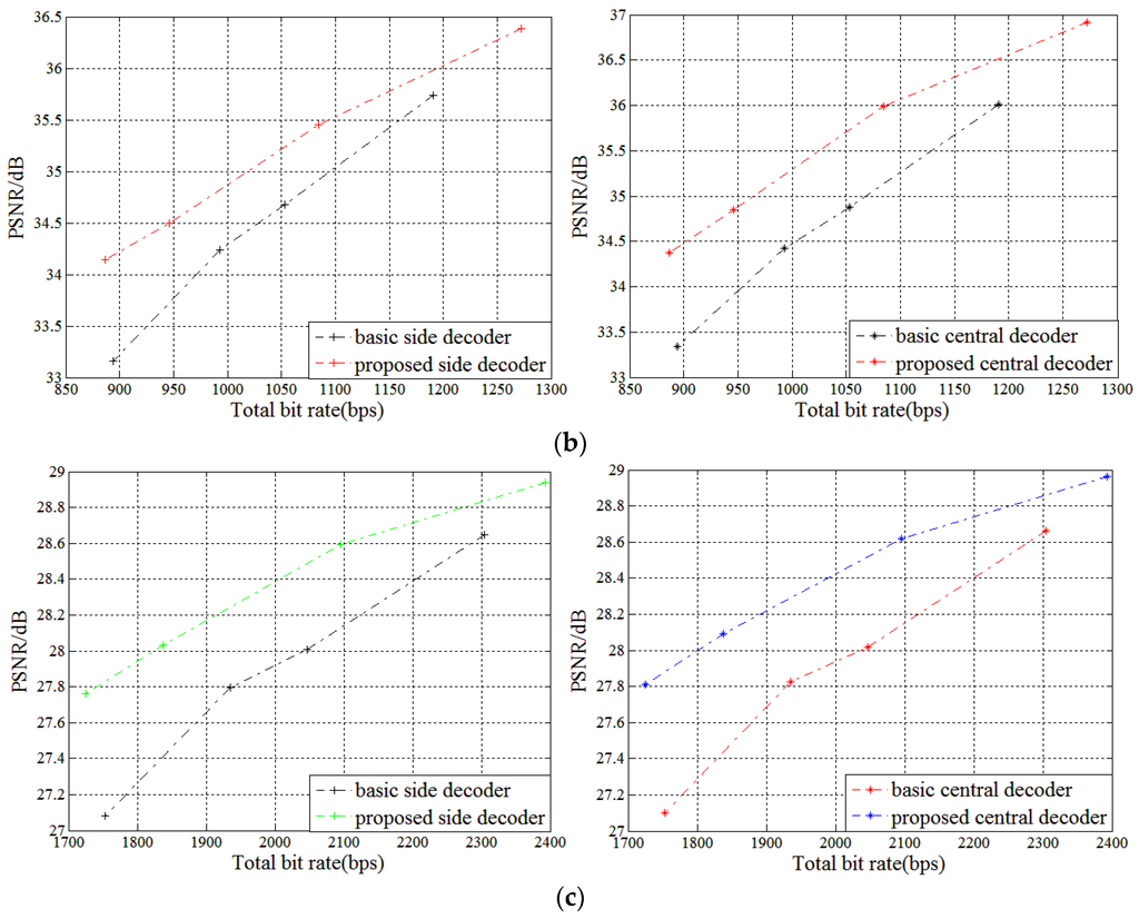 This paper focuses on the comparison of the proposed optimized scheme against the conventional scheme. To prove the universality of the experiment, some groups of data in each sequence are selected for comparison. According to the MDC quality assessment, we compare not only the rate central distortion performance when two descriptions can be received correctly, but also the rate side distortion performance when only one description can be received.