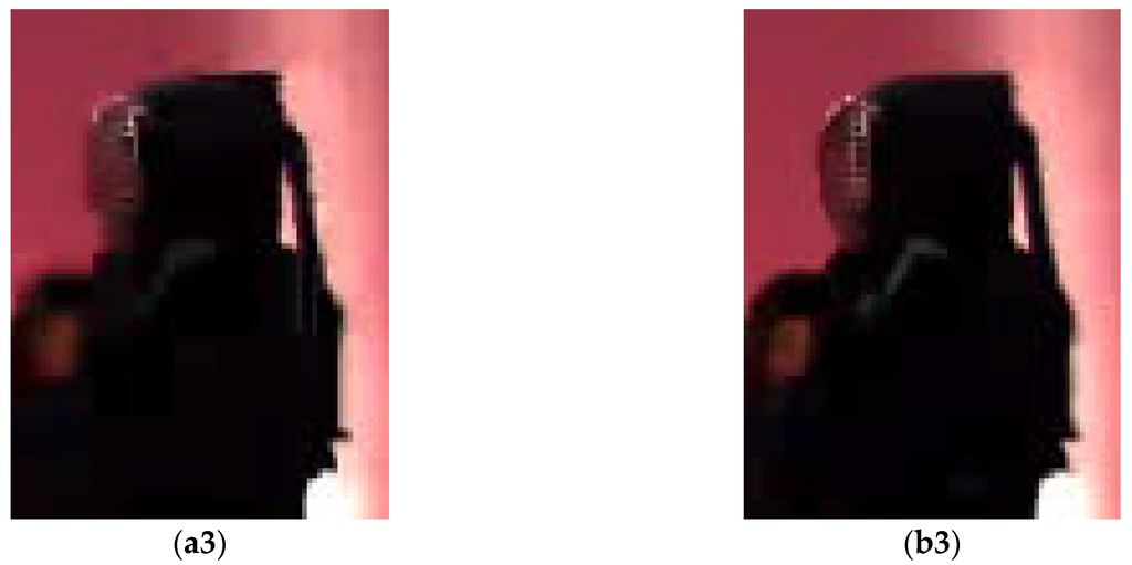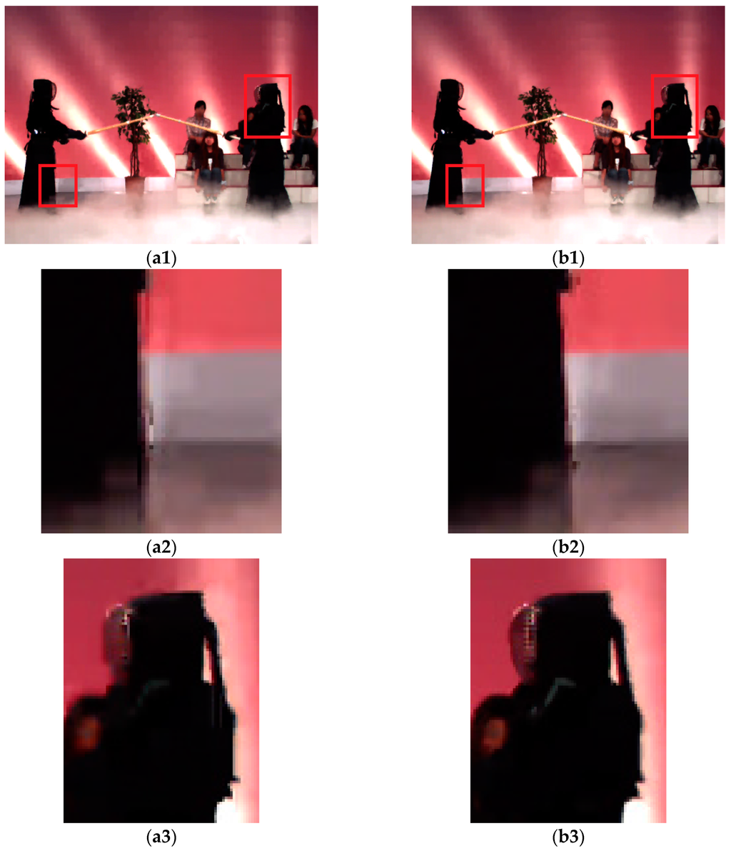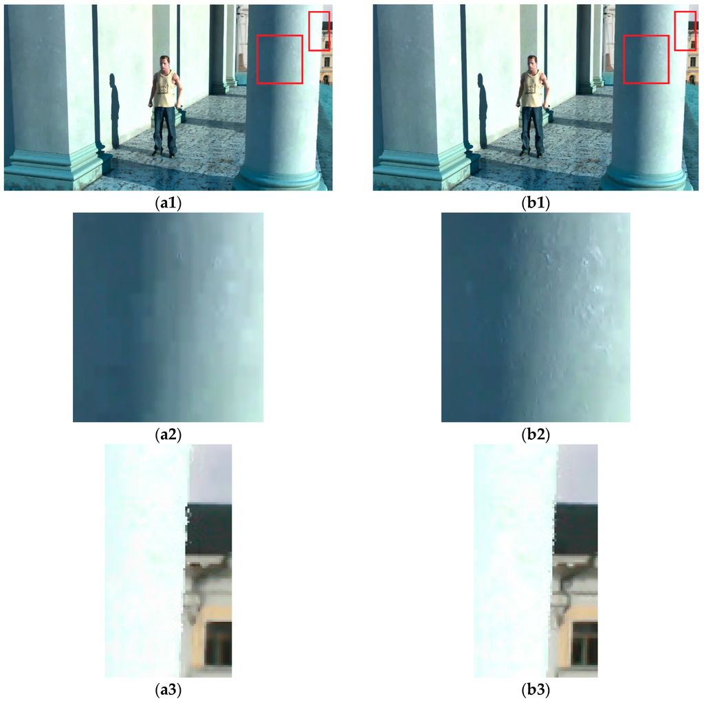 Given that the depth map is not directly used for display, the objective and subjective qualities of the rendered virtual views should be taken into account. In the aspect of objective quality, the synthesized virtual viewpoint image can be achieved by two original camera images. For example, for the tested sequences Balloons, Kendo and Dancer, the depth and texture from the first and third views can be used to synthesize the texture of the second view, while for the sequence Newspaper, the depth and texture from the second and fourth views can generate the texture of the third view, and for the sequence Pantomime, the depth and texture from the 37th and 39th views can be used to synthesize the texture of the 38th view. Here, the texture image is also compressed, and the comparison for synthesized images is presented in (c). Compared to the basic comparison scheme, our proposed synthesized scheme can one average improve around 1.1 dB for Balloons, 0.5 dB for Kendo, 0.4 dB for Newspaper, 2.2 dB for Dancer and 2.6 dB for Pantomime in side distortion and around 1.1 dB for Balloons, 0.6 dB for Kendo, 0.4 dB for Newspaper, 2.2 dB for Dancer and 2.7 dB for Pantomime in central distortion at the same or a very close bit rate.