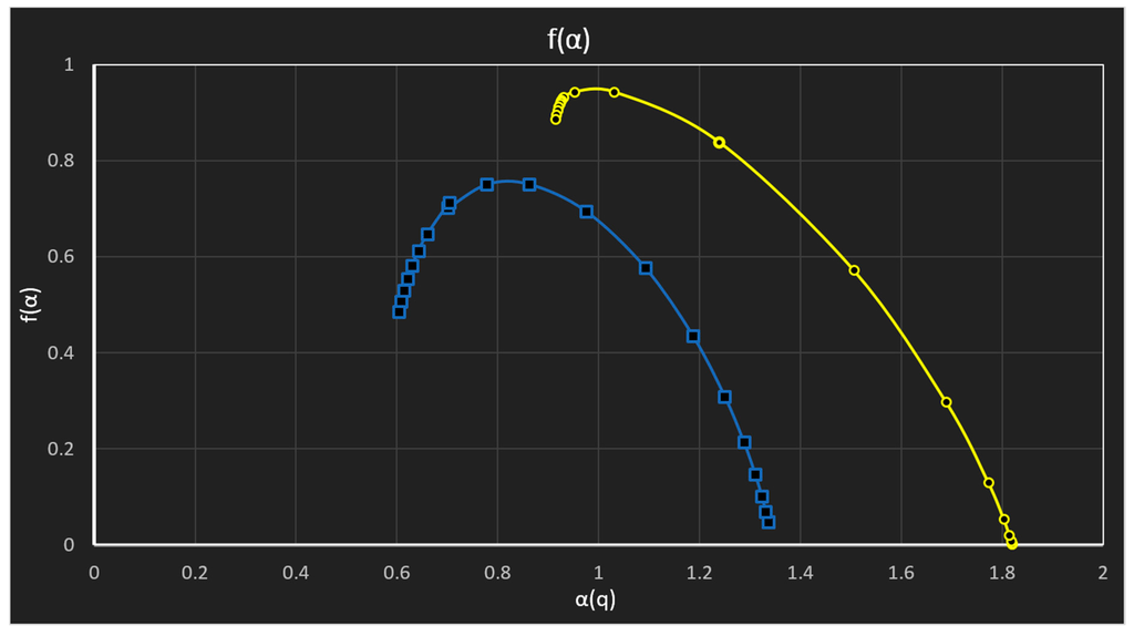 22] have discussed the important thermodynamics aspects of multifractality in physics and chemistry, founding the formal analogy among the probability distribution function Z(q) and partition function Z(β). Therefore, the analogy between the Legendre transform f(α) and entropy (H), as well as between the function α and energy E (see Stanley and Meakin [