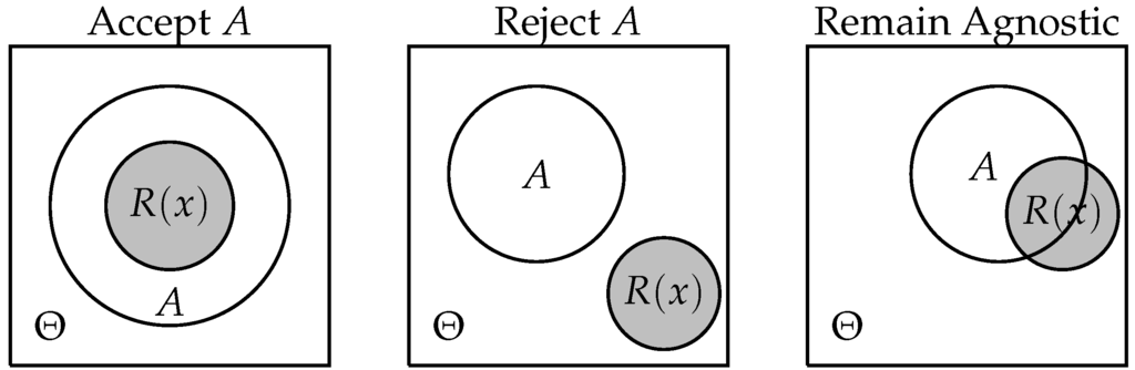 The ATS in Example 1 rejects a hypothesis if the value of the statistic is small, accepts it if this value is large, and remains agnostic otherwise. If is a measure of how much evidence that x brings about A, then this ATS rejects a hypothesis if the evidence brought by the data is small, accepts it if this evidence is large, and remains agnostic otherwise. The next examples present particular cases of this ATS These examples will be explored in the following sections.