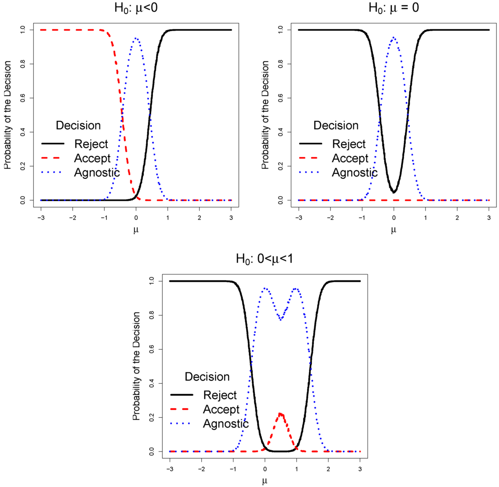 Consider . In Figure 2, we illustrate how the probability of each decision, for , varies as a function of μ for three hypotheses: (i) ; (ii) ; and (iii) . We consider the standard region estimator for μ, with . These curves represent the generalization of the standard power function to agnostic hypothesis tests. Notice that is never accepted, and that, under the null hypothesis, all tests have at most 5% of probability of rejecting H.