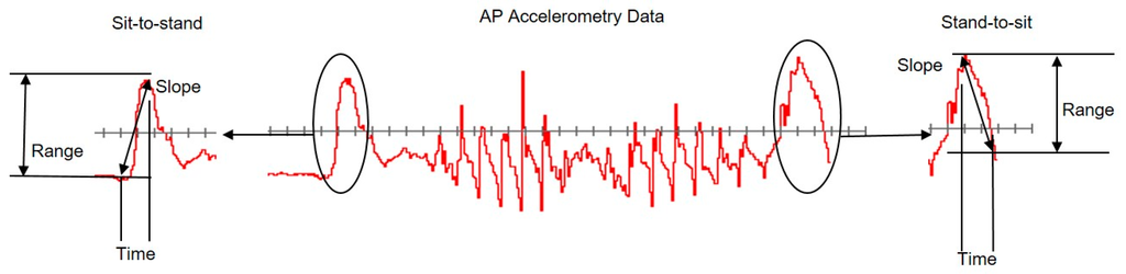 - Range: Difference between the maximum and minimum acceleration values in the Sit-to-Stand or the Stand-to-Sit aspect of the TUG.