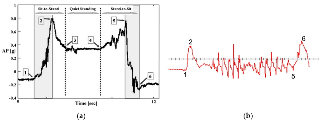 When explaining our segmentation points, we recommend Moe-Nilssen’s [41] calibration algorithm, which transforms the data to the horizontal-vertical coordinate system. Figure 3a shows an example of the acceleration signal in a young, healthy adult as he performed a Sit-to-Stand, followed by quiet standing, then a Stand-to-Sit [17]. In our study, we categorize these definitions in Table 2. In this work, interval 1–2 was examined with reference to the Sit-to-Stand task and interval 5–6 was examined with reference to the Stand-to-Sit task.