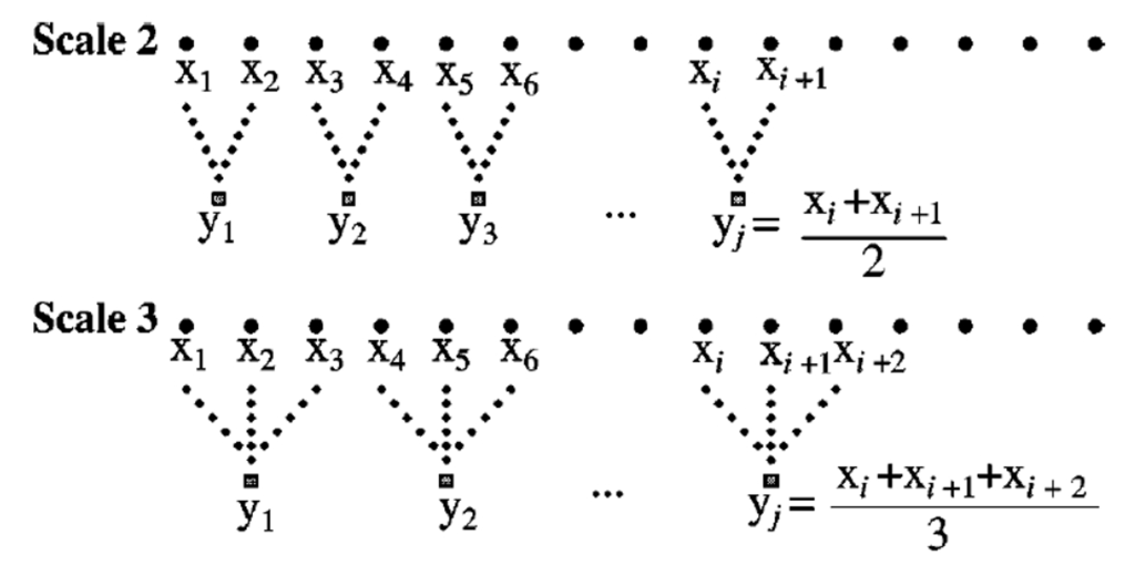 Figure 4. Coarse-graining process [30]. - Sample Entropy: After using of Coarse-graining process to obtain time series for different time scales, you can calculate the time series individually for sample entropy. The sample entropy calculation process is as follows:Step 1: Set the data comparison number m and threshold value r. m is usually set to 2 or 3, while r is usually set at 0.25.Step 2: Take m X data points in the time series data as the comparison benchmark. For example, for time series X = (x1, …, x7) , when data comparison number m = 2, the comparison unit group is . For the first time compare (x1, x2) with the other five unit groups. For the second time point, compare (x2, x3) with the other four unit groups.Step 3: When forming comparisons, calculate the maximum difference in the comparison group. The calculation method follows formula (2):Step 4: Compare the calculated with r × S. where S is the standard difference of original time series data point. If is smaller than r × S, then the two comparison groups are similar. In addition, add 1 to the accumulated similar number ni(m), and calculate the occurrence probability of similar number Ci(m) after all comparison processes are completed. The calculation method follows formula (3).Step 5: Return to step 1 and change the original comparison number m to m+1, repeat step 2 to step 3 and obtain the accumulated similar number ni(m) and the occurrence probability of the similar number Ci(m+1). The calculation method follows formula (4):Step 6: Take the average of all occurrence probabilities of the similar number Ci(m) with the comparison number m as the denominator, take the average of the occurrence probability of the similar number Ci(m+1) with the comparison number m + 1 as the numerator, and take the natural logarithm and negative value as the sample entropy. The calculation formula follows (5):