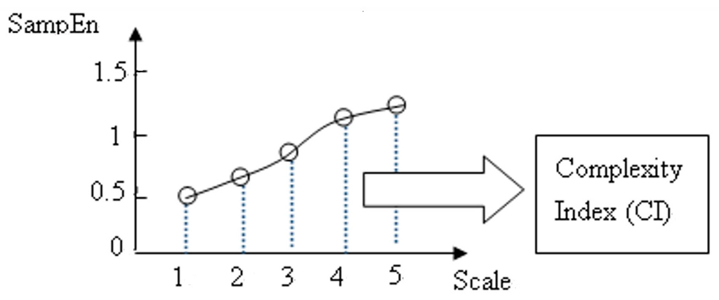 - Complexity Index (CI): We can plot SampEn as a function of the scale factor to calculate the area under the CI, as shown in Figure 5. The grey area under the black curve represents the complexity Index (CI). The calculation method follows formula (6):