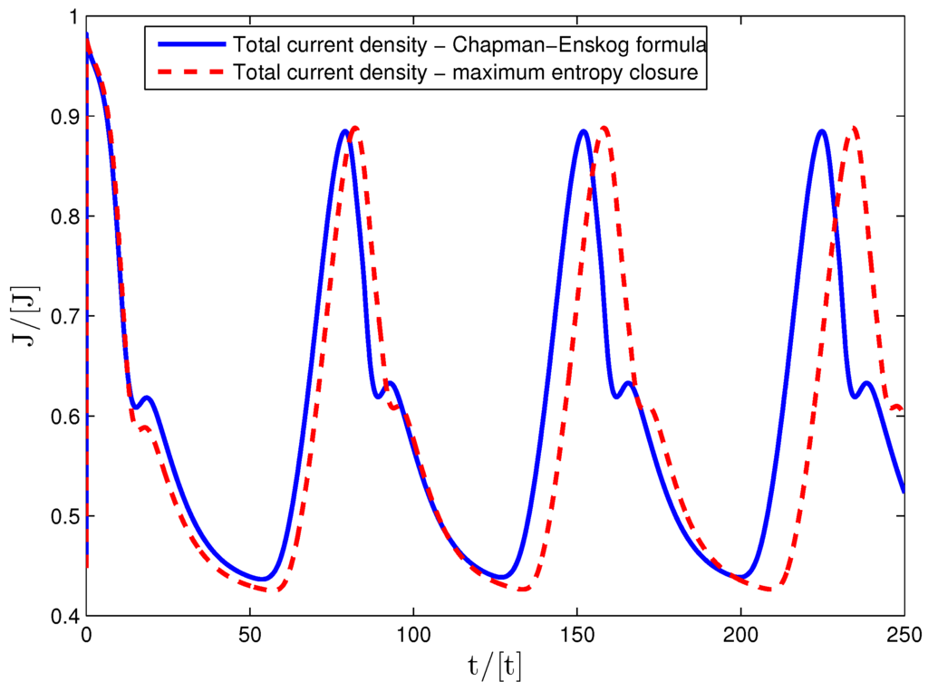To solve numerically the balance equation, we set a voltage within the interval for which there is an asymptotically stable time-dependent solution. As maximum entropy and Chapman–Enskog formulas give the same current–voltage characteristic curve for uniform fields, a comparison of oscillatory solutions seems more appropriate to highlight differences between both formulations. Each oscillation period of the current density corresponds to the generation of an electric field pulse at the emitter contact , its motion towards and annihilation at the receiving contact [16,19]. The nondimensional parameter λ is relatively large, , so as to appreciate the differences between the results of numerically solving the balance equation obtained using the consistent Chapman–Enskog perturbation procedure and the maximum entropy closure. The Chapman–Enskog procedure yields an excellent approximation to the numerical solution of the Boltzmann–Poisson equation, as shown in [21]. Figure 2 shows that the maximum entropy closure produces a slightly larger oscillation period which results in the observed shift. The corresponding oscillation frequencies are 31 GHz (maximum entropy) and 32.3 GHz (Chapman–Enskog), which result in a 0.04 (4%) relative error. This is quite small compared with the perturbation parameter that measures the differences between both approximations.