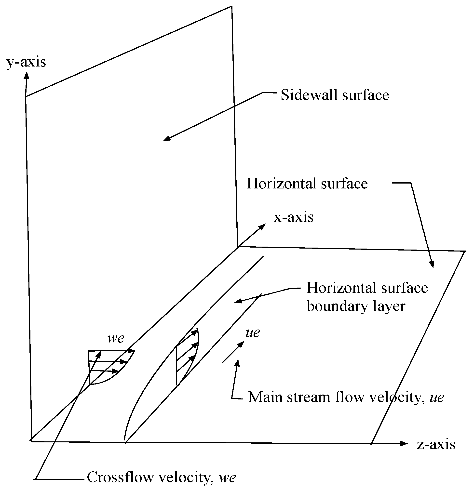 The boundary-layer configuration considered in this article consists of a laminar boundary layer in the x-y plane produced by the stream wise velocity along the horizontal surface and a laminar boundary layer in the z-y plane produced by mass injection from the sidewall in the z-direction. The momentum equation for the thin-shear boundary layer approximation may be written ([2], pp. 39–45) as: