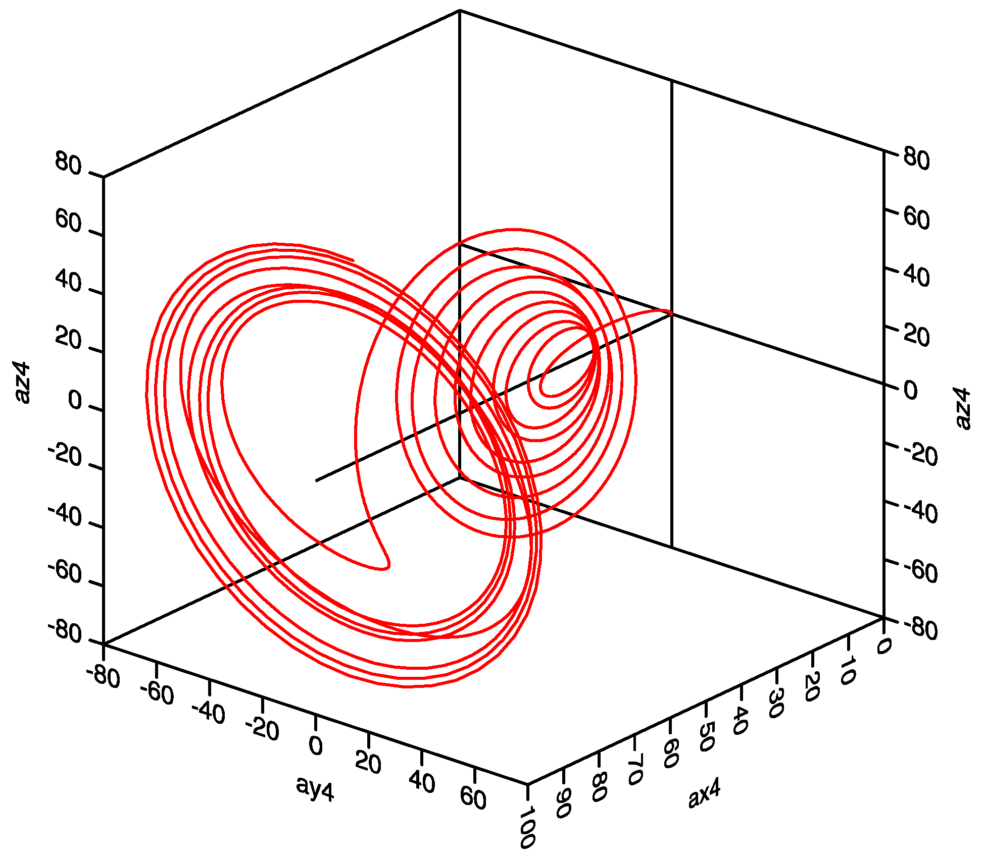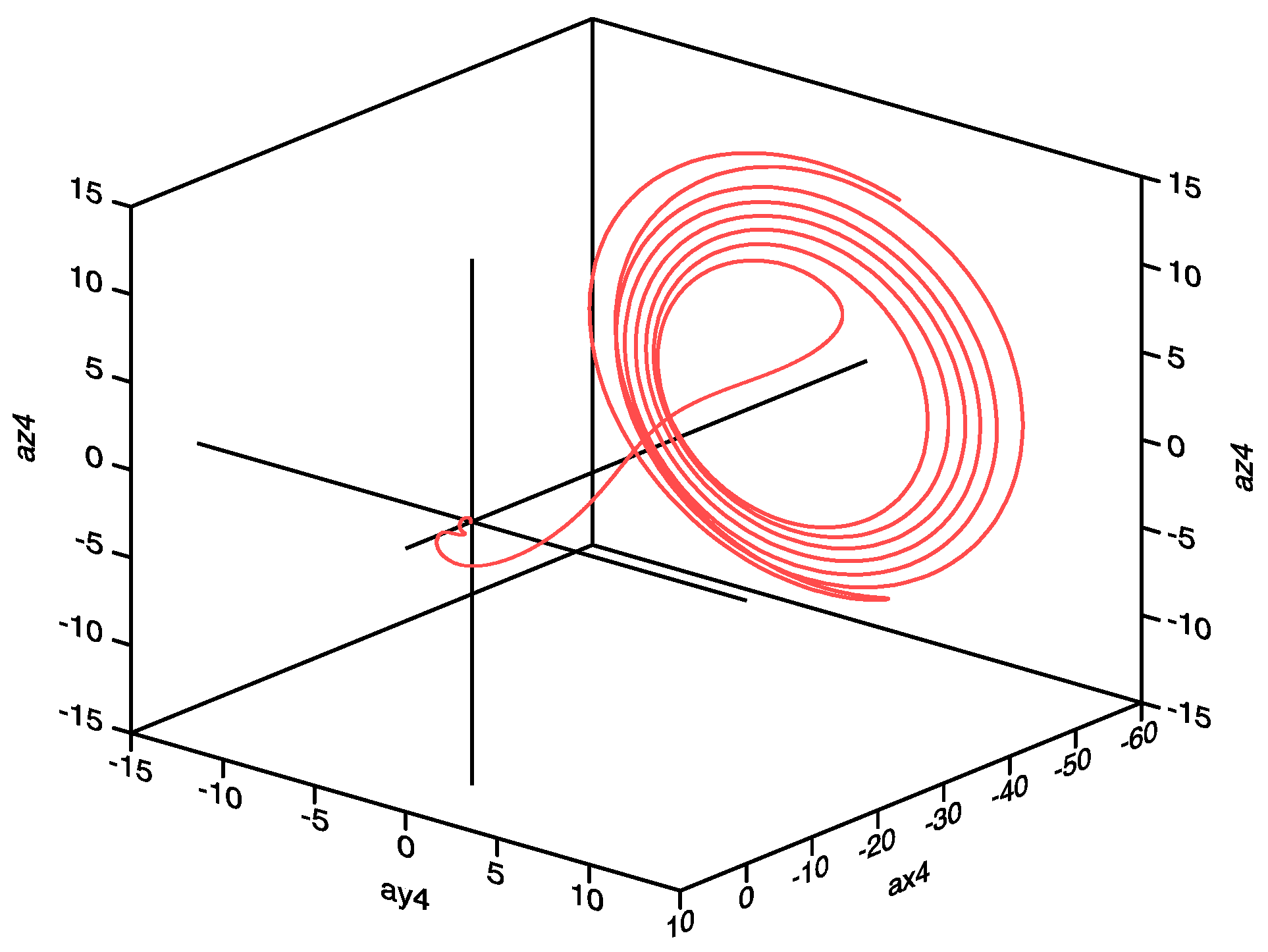 Figure 2 presents the deterministic three-dimensional spectral velocity wave trajectory for the downstream station of x = 0.140, for a sidewall mass injection velocity of we = 0.0800. Figure 3 shows the corresponding phase diagram for az4–ay4, where ay4 is the normal spectral velocity wave component and az4 is the span wise spectral velocity wave component, again at the station x = 0.140.