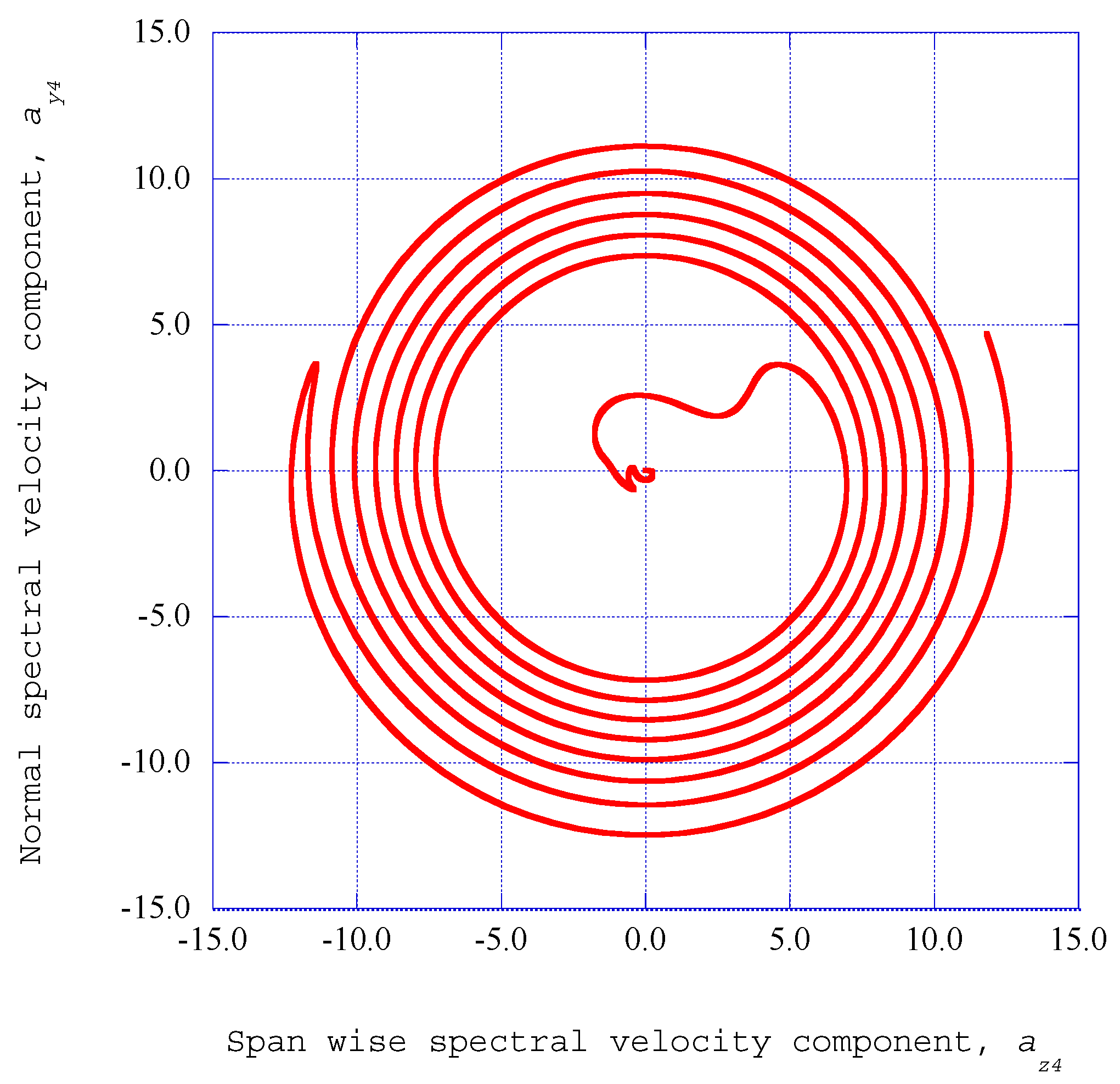 The phase diagram of the span wise and normal spectral velocity components, az4–ay4, is shown for x = 0.140, η = 1.40 and we = 0.0925.