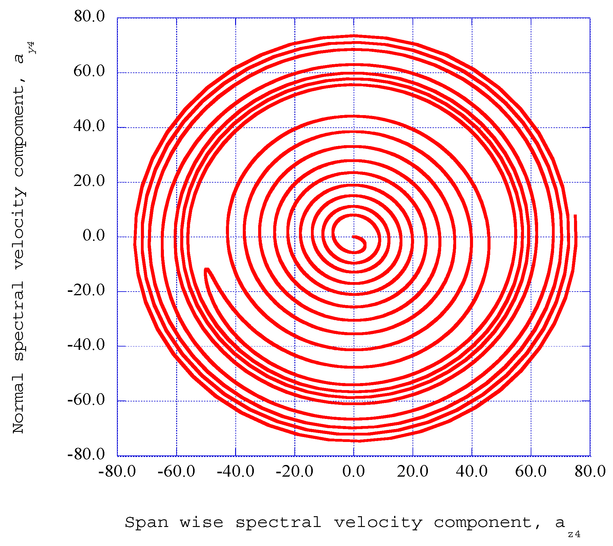 The phase diagram of the span wise and normal spectral velocity components, az4–ay4, is shown for x = 0.140, η = 1.40 and we = 0.0800.