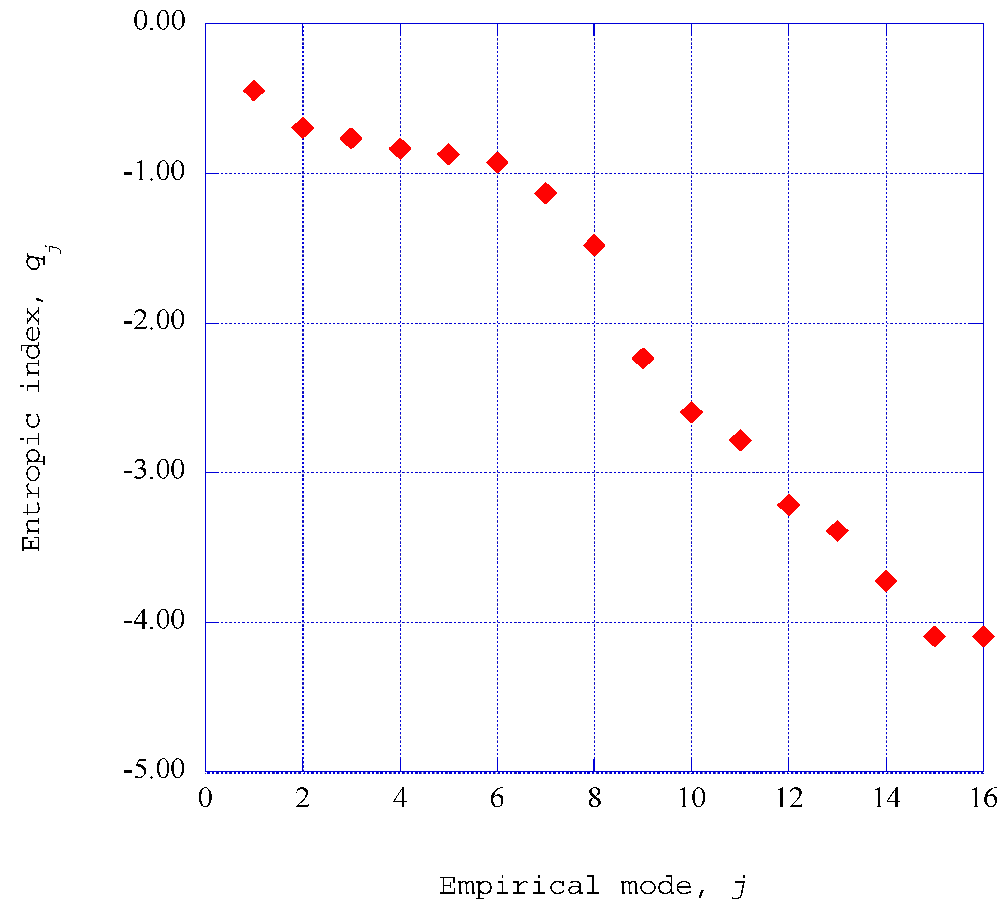The Tsallis entropic format is applicable to a variety of microscopic and macroscopic sub-systems. We are working with a collection of statistical sub-systems spread over a limited number of empirical modes, j. Note that this is not a sequence over time, but is a sequence in phase space [8] (pp. 409–412). The empirical entropy, Sempj is introduced to describe the entropy of an ordered structure described by the empirical eigenvalue, , for the singular value decomposition empirical mode, j. Hence, we simply adopt, in an ad hoc fashion, an expression from which we may extract an empirical entropic index, qj, from the empirical entropy, Sempj. This expression is written as [14]: