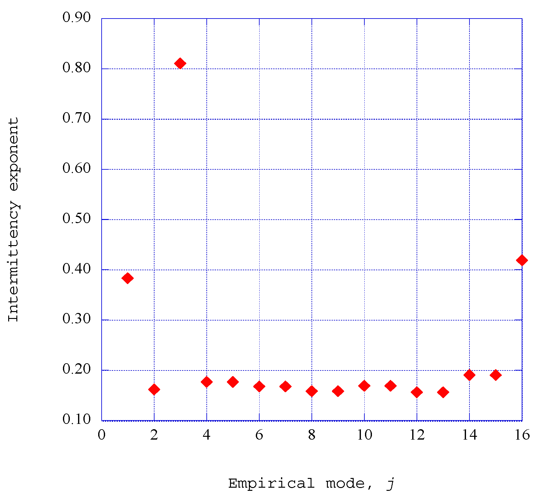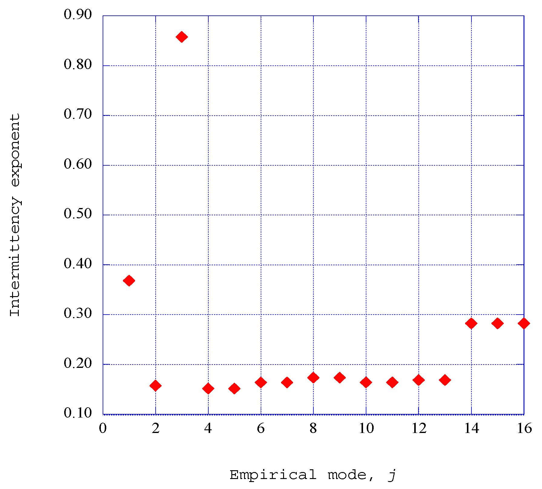 The empirical entropic index for the normal spectral velocity component is shown as a function of the empirical mode, j, for x = 0.140, η = 1.40 and we = 0.0925.