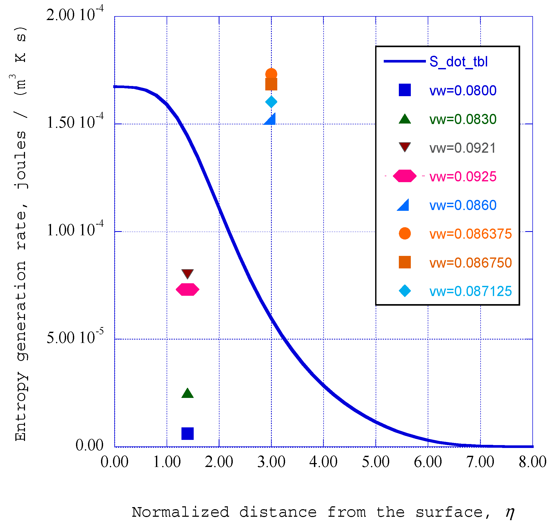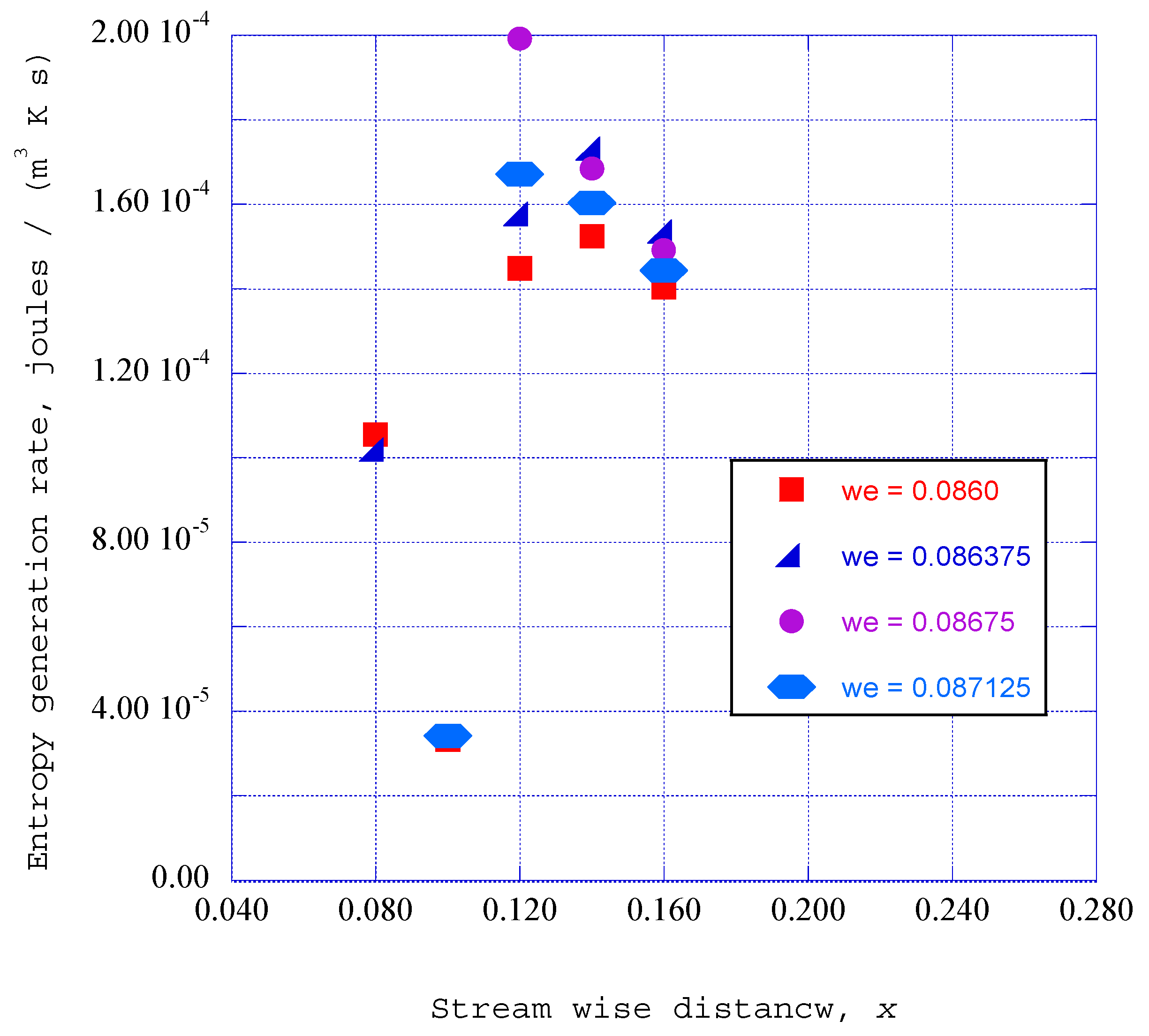 The stream wise velocity has been chosen as ue = 1.00 for all of the cases considered in this study. We have chosen to present the results obtained at the station of x = 0.140 since the results for this station indicate the clearest power spectral density peaks in the overall set of statistical results. However, it turns out that the results for this station also indicate the lowest level of entropy generation rates at the normalized boundary layer location of η = 1.40 for the crosswind velocity of we = 0.0800. This choice for the presentation of the results should therefore be kept in mind in the comparison of entropy generation rates for the overall set of crosswind velocities.