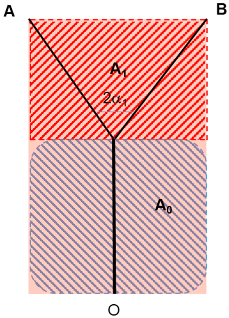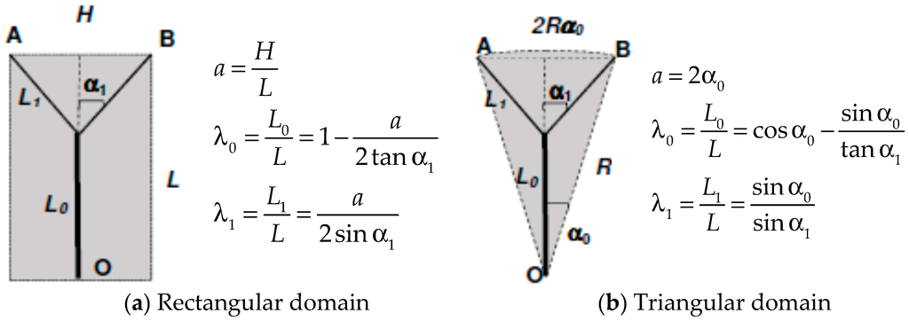 where U and V are the axial and radial velocity respectively and tangential periodicity is assumed. U, V and T are local and time-dependent quantities, and therefore in the context of the present analysis it at the moment is irrelevant whether the flow is turbulent or laminar. The derivative in the axial direction has been maintained to include entrance length effects, which will though be neglected for the moment. Let us consider, in line with Murray’s original suggestion, that the scope of the branching is to deliver the fluid from an origin or source (point O in Figure 1) to two endpoints or sinks (A & B). Our goal is to show that, whether the “basin of influence” of the branching is a rectangle or a circular sector, the total entropy generation within the region where the bifurcation appears is an explicit function of, among other parameters, the aspect ratio of the surrounding domain [14,29]. The first step is to relate the values of L0 and L1 (a similar derivation applies to any Li+1) to the splitting angle α1 and to the aspect ratio of the area “served” by the flow, which may be defined as a = H/L or a = 2α0 for rectangular and triangular domains respectively. A first relevant finding is that for triangular domains (circular sectors, a geometry relevant to heat exchanger design), Murray’s angle law does not apply, because α0 ≤ α1. Figure 1 shows the respective formulae, derived using elementary trigonometry. We shall henceforth present the calculations for a single bifurcation in rectangular domains, as a function of the aspect ratio a = H/L that defines the domain in which the bifurcation takes place. A remark is in order here: all calculations presented in this paper are related to steady flow, and pulsating effects and compliant walls are excluded from this model: the emphasis is placed here on rigorous fundamental principles rather than on a higher degree of complexity.