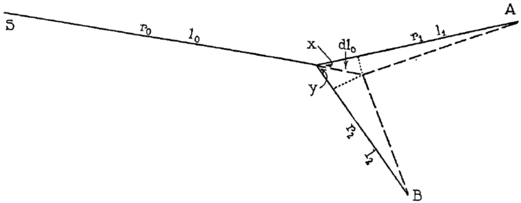 In [5] he also provides an original formula for the branching angle, given the splitting point and the two endpoints of the branchings (Figure 2), extends the treatment to non-symmetric branchings and to trifurcations, and remarks that the results ought to apply equally well (and with the same limitations) to the branchings of xylems, the sap transport system in plants.