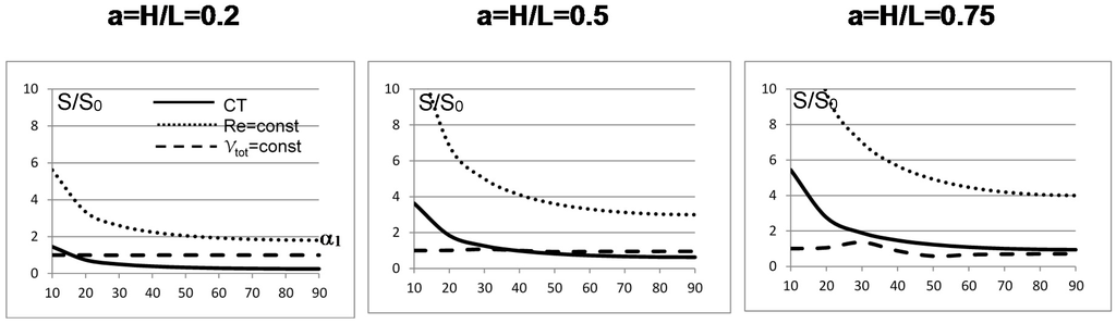 Minimum irreversibility ratio S/S0 as a function of the aspect ratio H/L and of the splitting angle α1 for different physical assumptions [29].