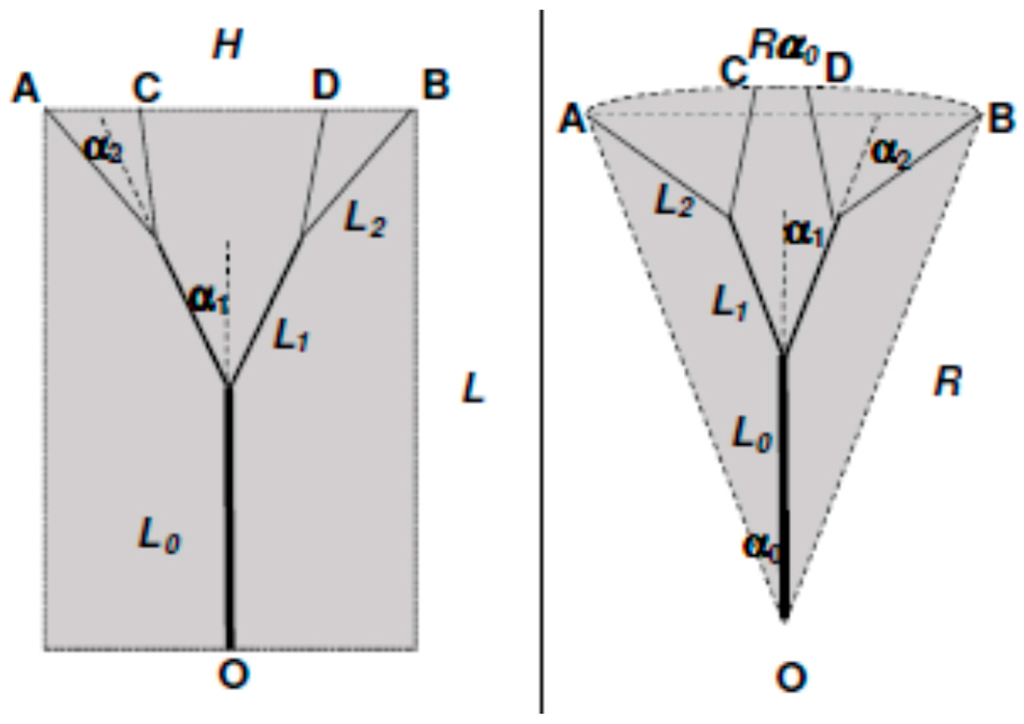 Notice that in Equation (19) the length ratio between successive branches appears as well, and since—except for case 4—Murray’s “optimal angle” relations do not apply, we need to use some different physical reasoning (cases 1,2,3 above) to establish a direct link between the radius—and the length ratio. In practice, we shall use the general geometric derivation shown in Figure 1 and select α1 as the running variable.