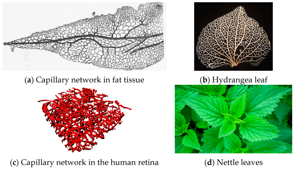Microscopic images of natural capillary networks. (a) Capillary network in fat tissue [33]; (b) Hydrangea leaf [34]; (c) Capillary network in the human retina [35]; (d) Nettle leaves [36].