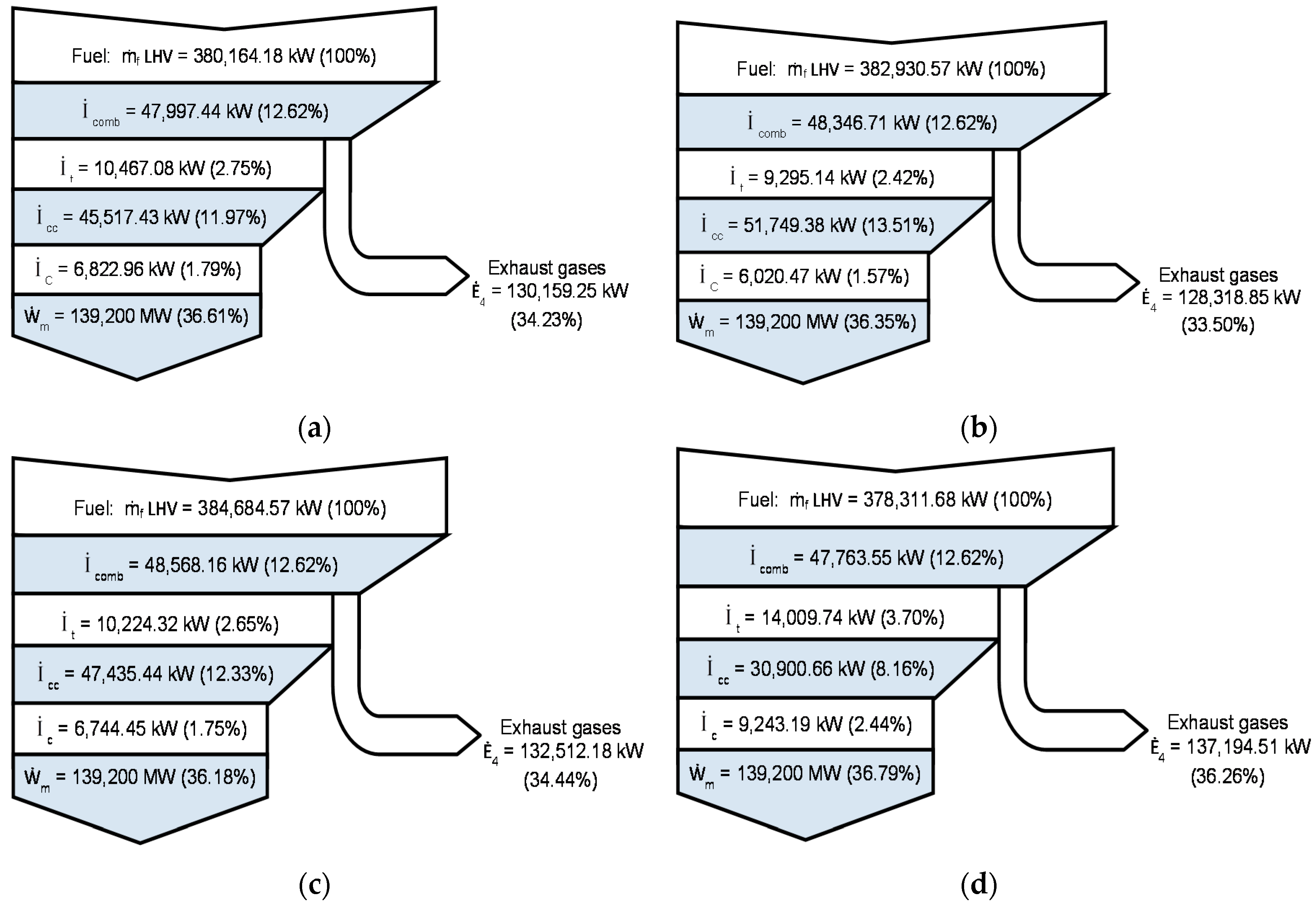 For the assumed natural gas composition and dead state temperature, the irreversibility generated in the combustion chamber represents 12.62% of the gas turbine exergetic losses. These irreversibilities are related to the adiabatic flame temperature, which in turn depends on the fuel gas composition, and the dead state temperature corresponds generally to the ambient temperature. The fuel gas composition is then a very important variable to control the performance, exergoeconomic, environmental, and human toxicity indexes. From a practical point of view, the proper operation and maintenance of the fuel gas conditioning system and the combustion chamber are critical to avoid increasing the irreversibilities in the combustion chamber. Since the combustion chamber is the gas turbine component that presents the highest irreversibility, and the exhaust gases are the main source of exergetic losses, thus, this gas turbine component has the lowest exergetic efficiency, as well as the highest exergoeconomic operation costs.