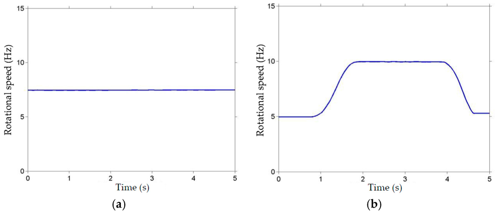 Different rotating speed profiles. (a) Constant speed; (b) speed-up and speed-down; (c) speed-down; and (d) speed-up.
