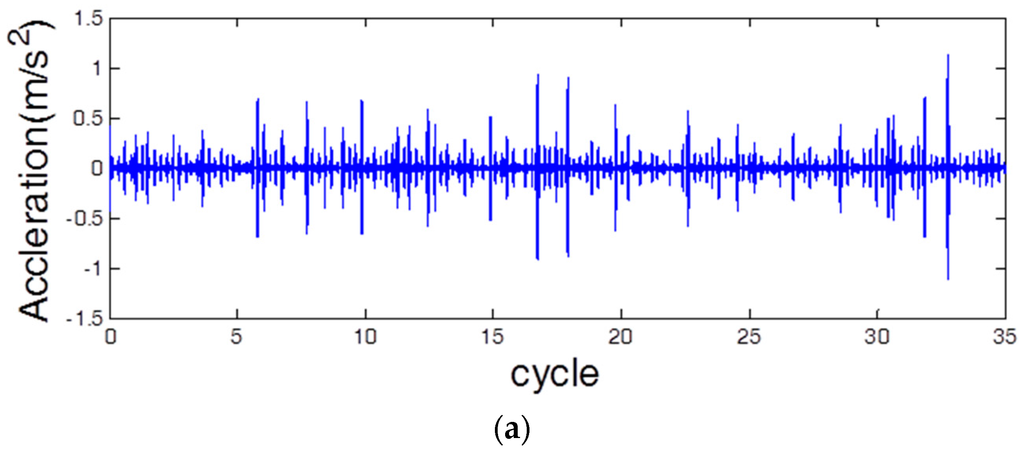 All of the recorded vibration signals were separated into a number of IMFs by the EMD method [17]. Since the collected vibration data were identical angular signals, the decomposed IMFs represent the signal components of different orders. In order to ensure that no mode-mixing problem exists in the EMD process, the standard IMF orthogonality index check [17] was also involved in the above signal separation steps. It is also noted that the order values of IMFs do not affect the calculation of MSE, so the angle-order distributions are skipped in this paper. Based on the observation, as well as the physical interpretation, the defective component impacts the other components of bearing cyclically and, thus, the amplitude modulation phenomenon can be observed in the measurements (as illustrated in Figure 3). The cubic spline fitting was then employed to extract the envelope signals of the vibration signals. It is also noted that all the first IMFs of the vibration signals which represents the signal component of the highest order have the apparent amplitude modulation phenomenon (as illustrated in Figure 4). The envelope analysis (cubic spline fitting) was also employed for the first IMFs of all of the vibration signals for comparison purposes.