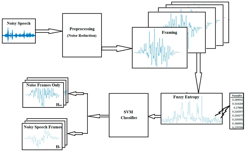 Finally, with the classification step, VAD results mainly rely on decision rule or by a threshold on the features extracted from the speech signal. The decision rule is either a simple threshold-based approach or some statistical models. Different classifiers based on machine learning algorithms (MLA) are also invoked for VAD results. One way is with the use of neural networks. Supervised neural networks have been widely used in classification, but the disadvantage with neural networks is its cost expensive training procedures. Other frequently used classifiers are k-nearest neighbor (k-NN) and support vector machine (SVM) classifiers [,,]. k-NN algorithm is a nonparametric MLA used in classification, where the classification takes place using the majority votes of its neighbors. Another nonparametric MLA proposed by [] is the SVM classifier, which is one of the powerful tools used to classify speech and non-speech signals, because of its convergence speed in the training phase, which is faster when compared to other classifiers. In our proposed method, SVM classifier is used for VAD under various noisy conditions. Irrespective of decision rules or any other classifier, selection of appropriate features will always impact the performance of VAD, because there are no unique features or multiple features considered with regard to improving the performance of VAD under various noisy conditions. So the problem regarding VAD is extremely challenging to the researchers. In our proposed method, fuzzy entropy is introduced as the feature extracted over the speech signal. Since entropy-based feature extraction is solid to discriminate speech and noise, it fails to discard cough and excessive breath from speech signals, which are treated as non-speech. Based on fuzzy set theory, to measure the complexity of the time series data, fuzzy entropy (FuzzyEn) [] was introduced. FuzzyEn is a modified algorithm of sample entropy (SampEn) [,,,,]. Since then, FuzzyEn has been successful in feature extraction. Similar to SampEn-based algorithms, FuzzyEn retains certain characteristics like excluding self-matches. Additionally, by inheriting the similarity measurement using fuzzy sets, the limitations cited by SampEn—which uses the Heaviside function as the tolerance to select or discard the similarities between the two vectors—was overcome by FuzzyEn, as FuzzyEn transits smoothly through varying parameters with the use of the exponential function.
