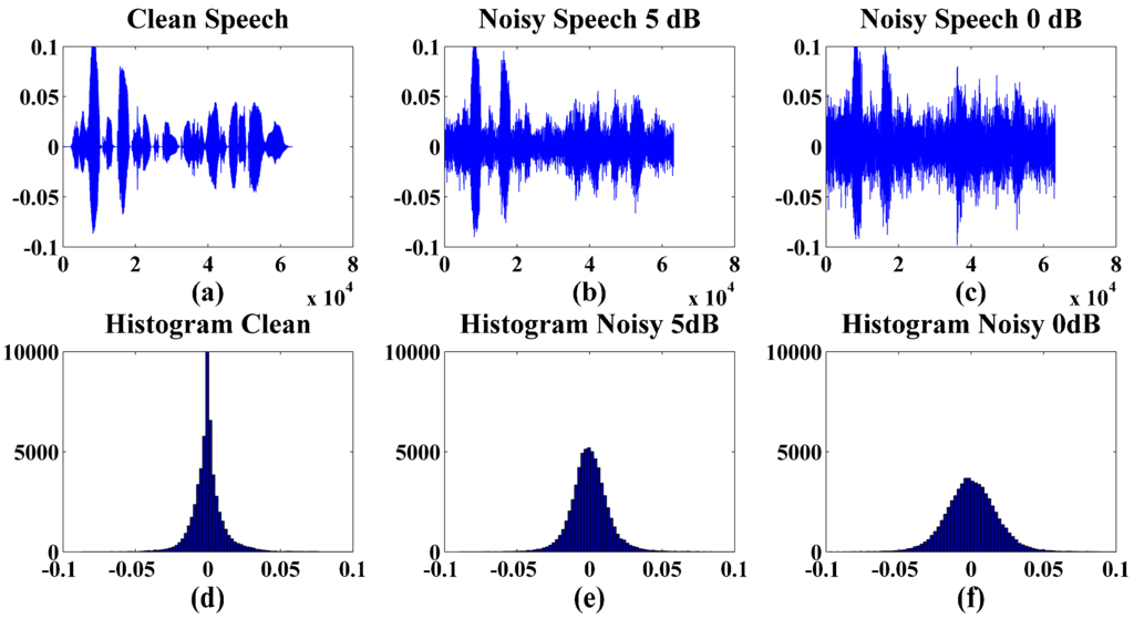 Speech signals (a–c) with its additive noise [0, 5 dB] with amplitude along vertical axis and time (s) along horizontal axis; its corresponding histograms (d–f), with amplitude along horizontal axis and frequency along the vertical axis.