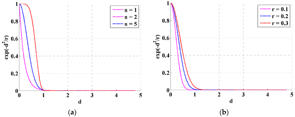 Exponential function (exp(−dn/r)) for different parameter selection. (a) Exponential membership function fixed with n = 2, and r varied from 0.1 to 0.3; (b) exponential membership function fixed with r = 0.2 and n varied from 1 to 5.