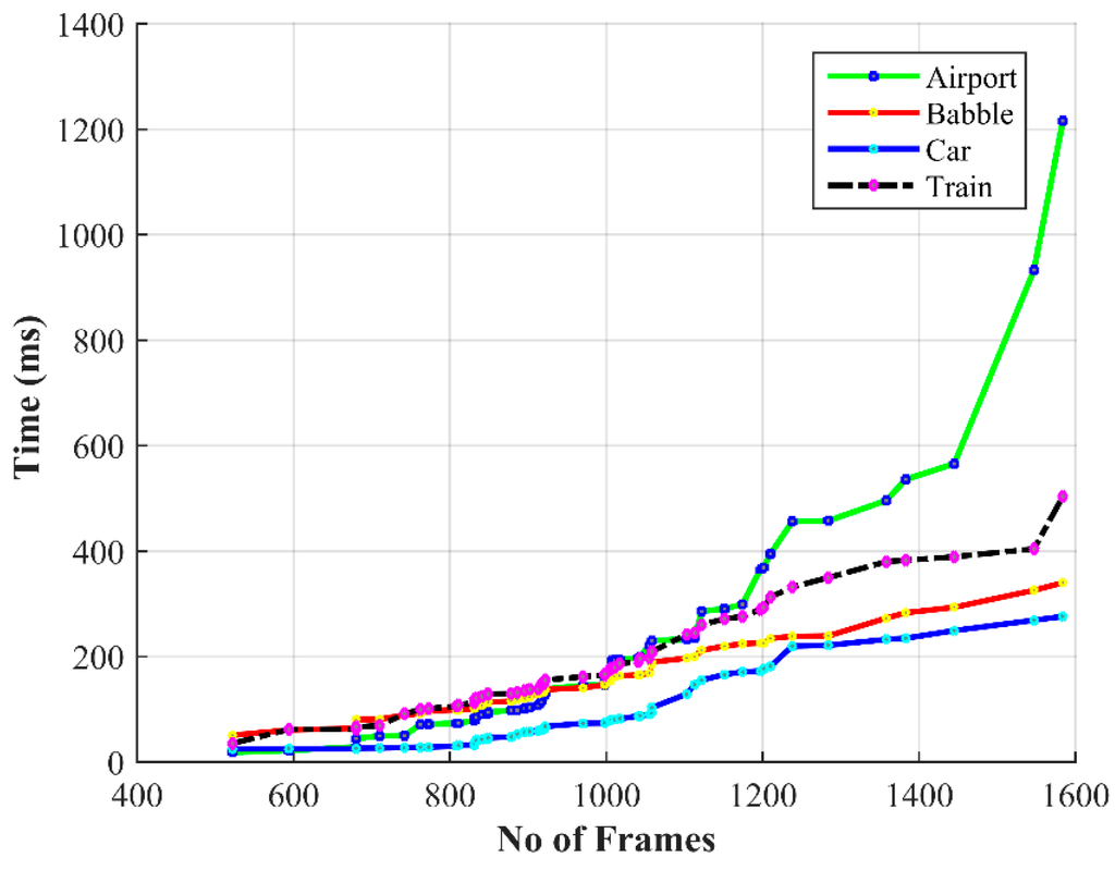 All experiments were conducted with MATLAB version 7.11 on a 2.4 GHZ Intel® CoreTM i7 processor running Windows 10 with 8 GB main memory. Figure 4 shows the average computing time for the SVM classifier to classify the speech and non-speech frames under various noises. From the figure it is inferred that as the size of the number of frames increases the computing time increases. Figure 5a–c shows the mean of sensitivity, specificity, and F-measures of various noises such as airport, babble, car, and train noise for FuzzyEn based VAD using spectral subtraction. Similarly, Figure 6a–c shows the standard deviation of the sensitivity, specificity, and F-measures for various noises. For various SNR levels, ranging from −10 dB to 10 dB, the parameters were computed and the graph shows that the detection of speech and non-speech frames are good by the proposed method, especially under low SNR conditions, except for car interior noise which contains a complex audible instance, where the sensitivity decreases when compared with that of the other noises.