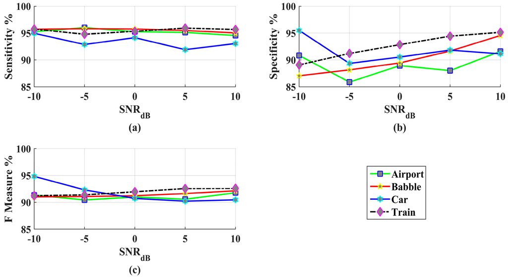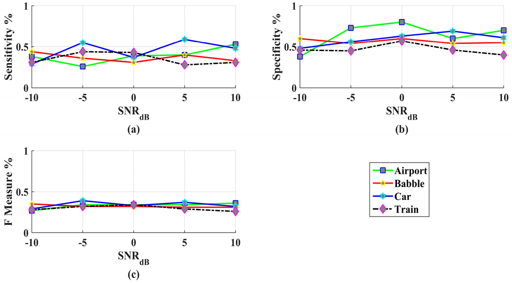 Average of (a) sensitivity (b) specificity and (c) F-Measure for the proposed FuzyyEn based VAD for the various noises such as airport, babble, car, and train.