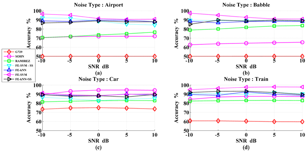 In Figure 7, the accuracy of the FE-SVM based VAD is compared against the various VAD algorithms for SNR levels ranging from −10 dB to 10 dB for airport noise, babble noise, car noise, and train noise. From the figure, it clearly states that G.729 suffers poor accuracy for airport noise with ~50% on average at various SNRs, whereas VAD algorithms by [,] performs better accuracy for airport noise, gradually varying at different SNR levels averaging ~71% and ~73% respectively. The proposed FE-SVM based VAD outperforms the rest, yielding ~92% average and ~90% without spectral subtraction (SS). Similarly, for the k-NN classifier, the accuracy is ~89% and ~88% with and without SS, respectively. For babble noise, the proposed FE-SVM based VAD has an accuracy of average ~93% and ~89% without SS, whereas [] produces ~81% and [] and G.729 manages ~64% and ~50%, respectively.