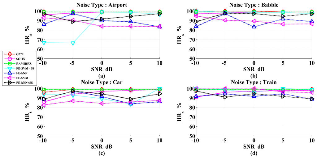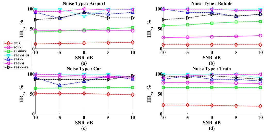 Figure 8 and Figure 9 show hit rate performance evaluation metrics for five SNRs for different kinds of noises computed for G.729B, [,] and proposed FE-SVM based VAD algorithms. Figure 8 provides comparison results for HRs, and Figure 9 provides HRns results for the various VAD algorithms. It is clearly observed that, for the different VAD algorithms considered, G.729B produces a better performance for HRs at different SNR levels for the different noises and suffers worst performance for HRns. For airport noise, the proposed FE-SVM based VAD lags in HRs to [] (~12%) and [] (~11%) and for FE-SVM − SS, HRs lags to [] (~14%) and [] (~13%). For babble noise, proposed FE-SVM lags to [] (~10%) and excels by [] (~9%) and for FE-SVM − SS the HRs performance lags to [] (~0.4%) and excels [] (~0.2%). For car noise, the proposed FE-SVM based VAD lags to both [,] (~13% and ~9%, respectively). Finally, for train noise, the proposed FE-SVM based VAD offers better HRs against [] (~2.4%) and suffers a lag against [] (~0.4%). Most VAD algorithms rely on the use of post processing techniques like hangover schemes [] which smooths the decisions at the frame level after the initial VAD decisions were made. This scheme reduces the risk of lower energy regions of speech at the ends of speech falsely rejected as noise. The number in the bracket indicates the approximate average hit-rates of speech and non-speech by which the proposed FE-SVM based VAD is better or worse than [,]. Similarly, for HRns performance, as shown in Figure 9, the proposed FE-SVM based VAD outperforms all the VADs considered under different SNR levels for various noises. The average HRns of the proposed FE-SVM based VAD is ~96% for airport noise, ~98% for babble noise, ~95% for car noise, and ~96% for train noise. Without this post processing scheme, the proposed FE-SVM based VAD yields ~90% average for HRs and ~95% above for HRns.