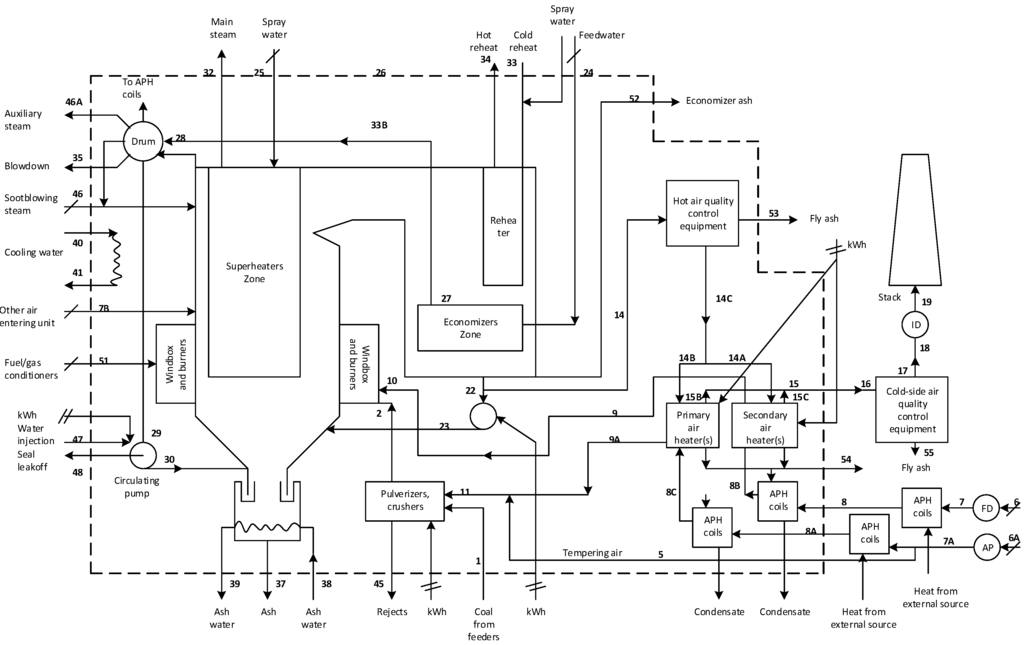 The unit considered in this study is a 350-MW front-fired, natural circulation, single reheat and balanced draft coal-fired boiler, which forms part of a 1050-MWe conventional power plant located in Spain. Figure 1 depicts the main components and energy flows of the case study boiler. Data from a boiler performance test are used to calculate the state of the boiler, see Table 1. This information is then used in a simulator as variable inputs to calculate all of the thermodynamic properties of the boiler, e.g., energy and exergy flows [12].