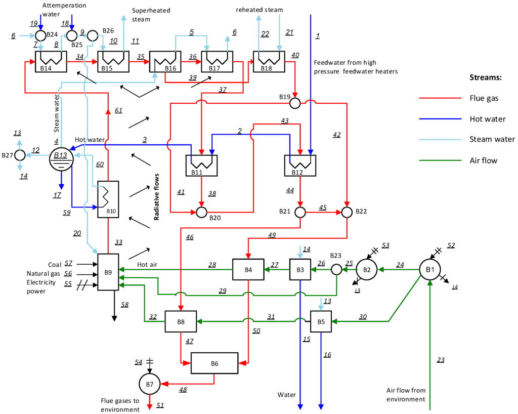 The operation of the furnace (B9), on the other hand, transforms the chemical energy of the fuels, coal and, at times, natural gas , into thermal energy . The radiation emitted from the furnace in all directions, , is caught by the downstream equipment (e.g., heat exchangers). The air required for the combustion, , is supplied by the upstream equipment, namely, forced and primary air fans. It is noteworthy that there appears also a flow of steam , which refers to the sootblowing steam.