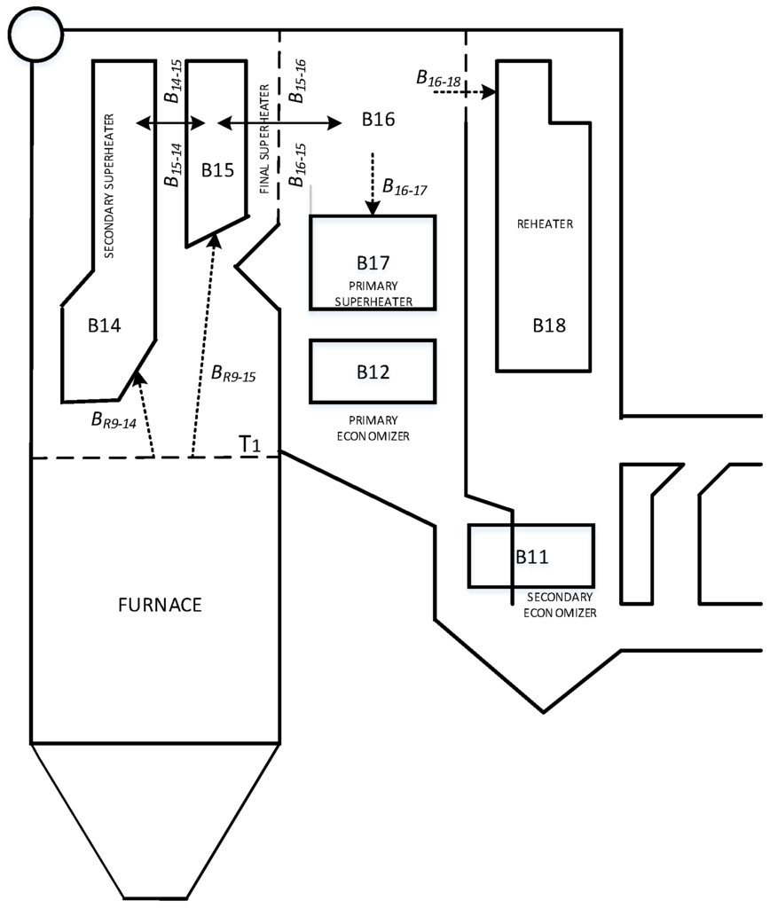 Taking into account Figure 3, it is possible to categorize three types of tube-bundle heat exchangers according to the heat transfer phenomena present in them: (a) convective tube bundles, which comprise the two economizers in the boiler, B11 and B12; (b) mixed convective-radiative tube bundles, which apply to sections close to the furnace or gas plenum, such as the primary and final superheaters and reheaters, B17, B15 and B18, respectively; and (c) radiative tube bundle, which applies only to the second superheater, B14, since this is located in the furnace enclosure.