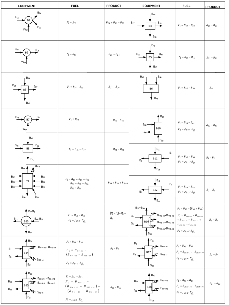 The Fuel-Product (F-P) definitions derived in this analysis are based on the exergy cost theory proposed by Valero et al. [21]. It is important to mention that the difference between thermal, mechanical and chemical exergy is not considered, but exergy from radiation is considered as proposed above.